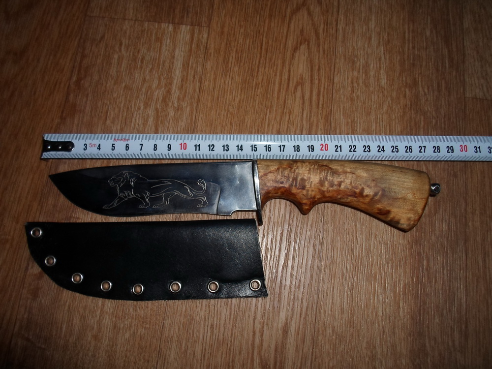 Сталь Х12МФ,гарда нержавейка,рукоять карельская берёза,монтаж сквозной. На всякий случай.
