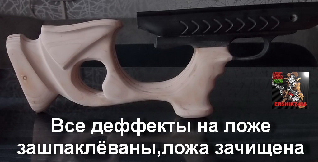 Для этого необходимо приготовить шпаклёвку из ЭДП и опилок в пропорции 50Х50,которые Вы оставили после пиления.Разводим клей,перемешиваем,добавляем опилки,снова хорошенько перемешиваем.Затем все найденные «косяки обрабатываем шпаклёвкой.Кстати,если Вы уже закрепили резиновый затыльник к прикладу,можно при необходимости обработать шпаклёвкой поверхность около него(может выступает,а может есть щели между поверхностями из-за недоклейки).Постарайтесь обработать все недочёты так,чтобы не было никаких сколов,трещин,сучков,щелей и т.д.Постарайтесь придать прикладу с ложей вид единого «монолита»,сделать их одним целым.Шпаклёвку наносите с небольшим запасом,лучше излишек удалить потом,в обработке засохшая шпаклёвка податлива.Сушим обработанный приклад около суток(шпаклёвка сохнет быстрее чем клей ЭДП).После высыхания обрабатываем эти участки с усердием наждачной бумагой,максимально!!!!На покраску надеется не стоит-никаких дефектов она не исправит,плохо обработанные участки будут очень коряво выглядить,в общем постараться надо.У меня получилось то что видите:И с другой стороны неплохо вышло:На этих фото затыльник приклада ещё не закреплён,приставлен к прикладу просто для наглядности,этим я занялся чуть позже.После этого досканально проверяем снова всё на наличие дефектов,при необходимости повторяем процедуру.Вот посмотрите:Результат кропотливой работёнки думаю неплох,с другой стороны:
