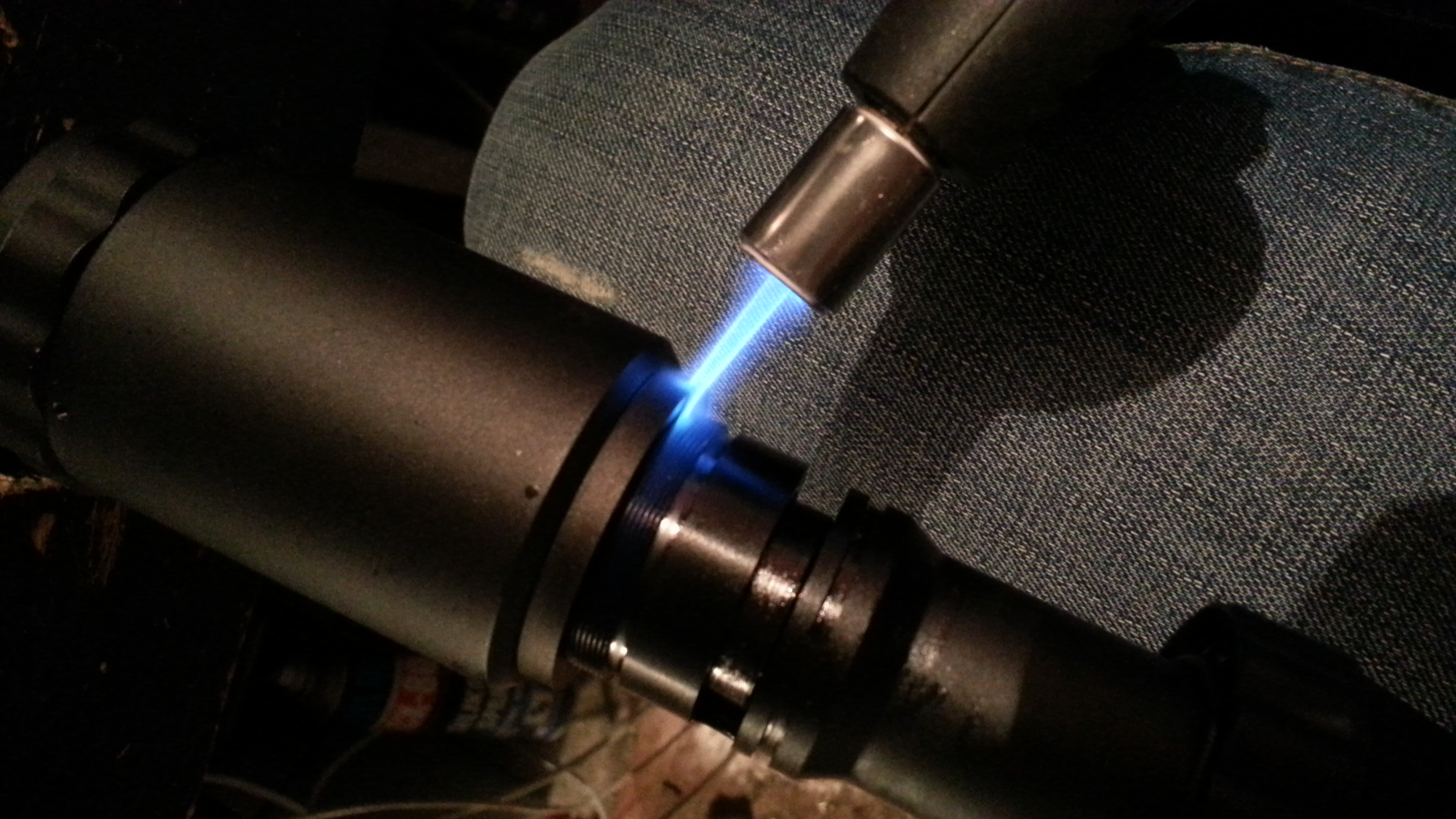 После очередного нагревания, зажимаем разводным газовым ключом за металлическую рамку, которая потом спрячется за кольцо кратности, и чуть чуть страгиваем циллиндр. Дальше не крутим - не пойдет, клей "тяжелый". Пусть остывает. После остывания, капаем на шов проникающую смазку - WD, или на крайняк Баллистол. Она немного впитается, и по мере, немного добавляете.