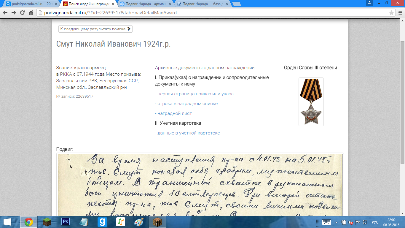 Знаю,что у отца было две Славы,но не могу найти документы,как и об остальных наградах.