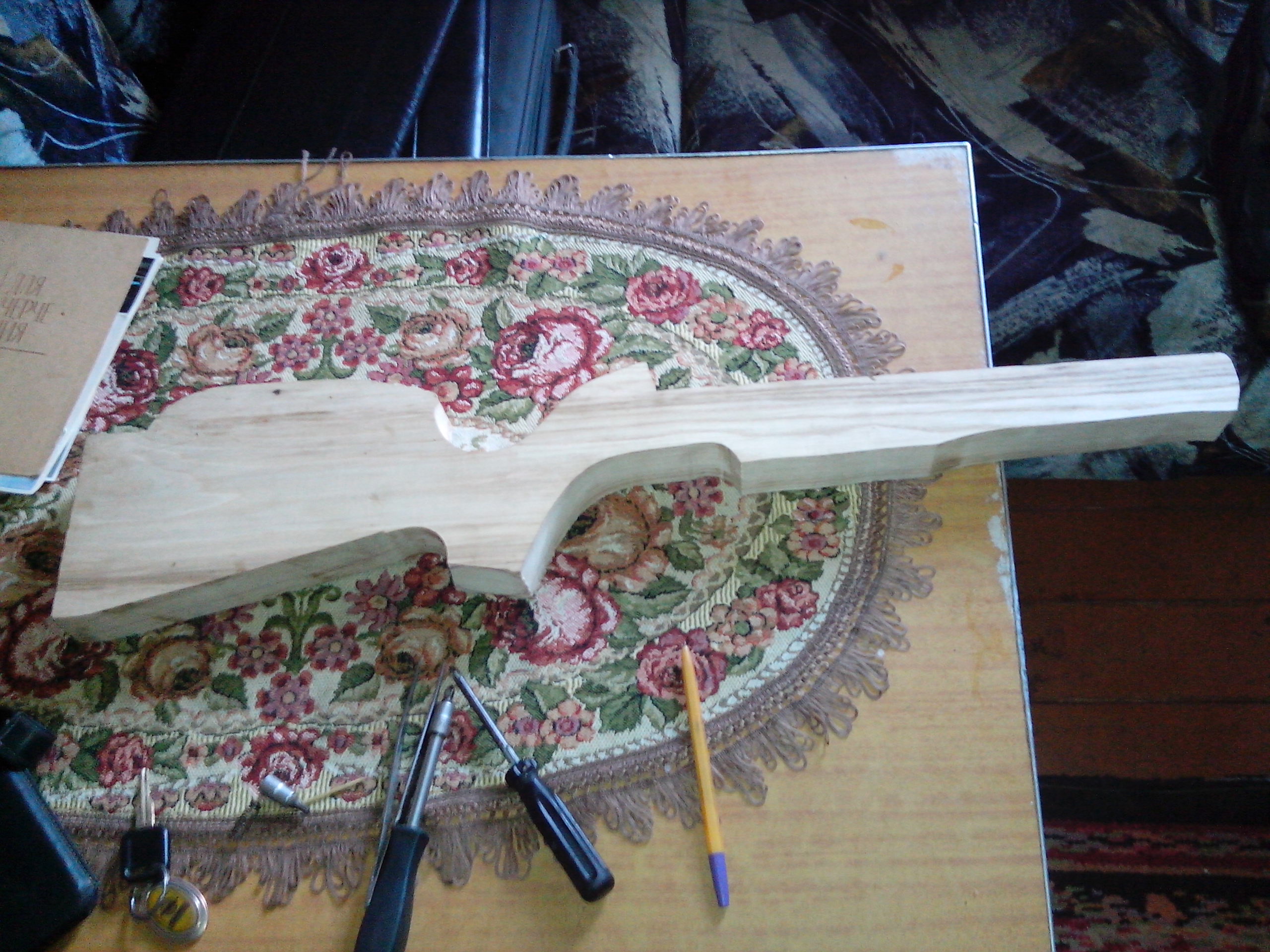 Уважаемые камрады, хочу предложить вашему вниманию буратину собственного производства в картинках. Началось с того, что после установки оптики на смерша р11 стало очень неудобно целится. Не скажу, что приклад смерша неудобный, он вполне пригоден для открытых прицельных, но после установки оптики он становится бесполезным для стрелка. т.к. линия прицеливания поднимается над прикладом до неприличного состояния. И так цели поставлены задачи определены - полено (вроде ясень, может граб) найдено в закромах, на нем начерчено примерно то, что хочу видеть, берется в руки электролобзик и оппппппа, через пол часа работы от перегрузки дым вонь и лобзика нет. Начинаю включать логику и вспоминаю о наличии пилорам с соответствующим оборудованием и спецами. Нахожу столяра, который за 100 тыров пилит мне буратину и делает черновую выборку под железо.