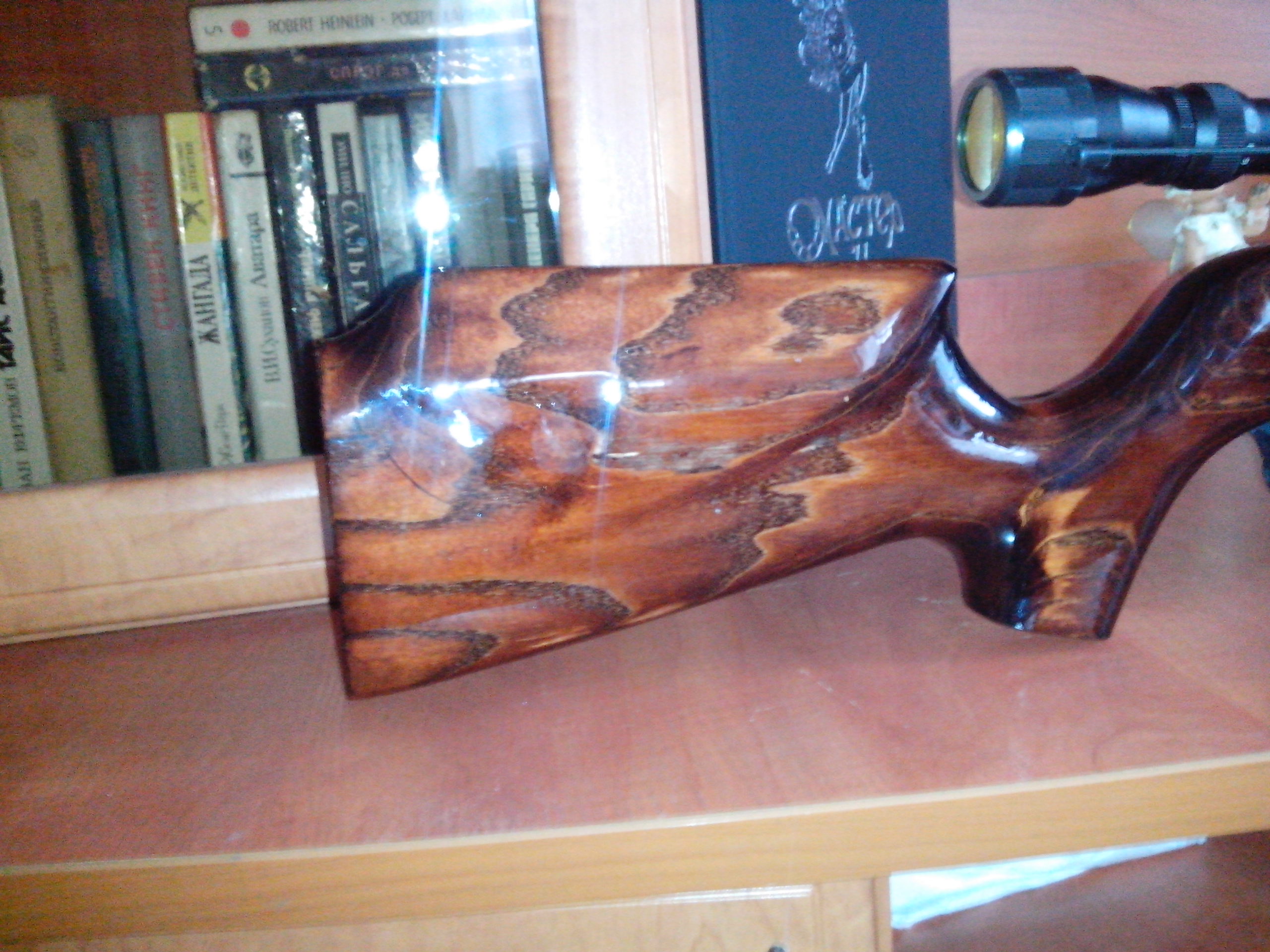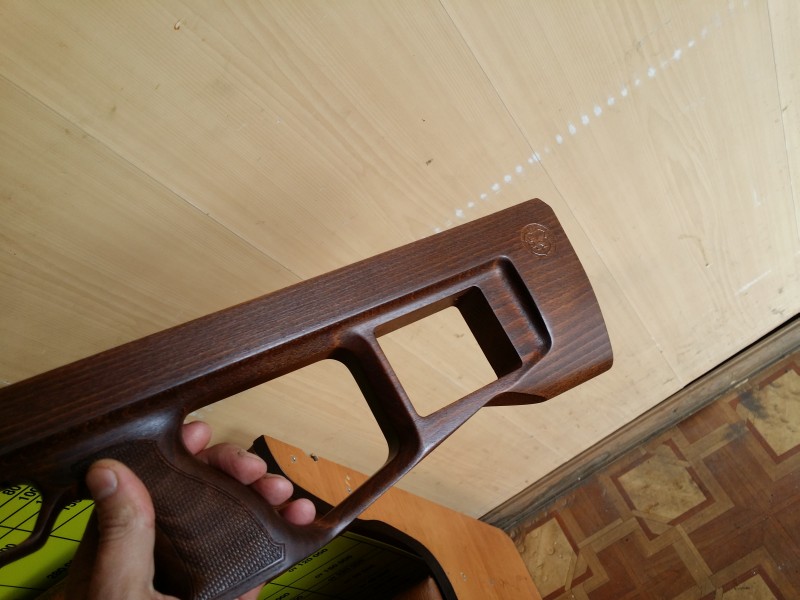 За три дня я положил шесть слоев лака, объясняю почему шесть, ночью я конечно не красил, но по малярному феншую ложится два слоя один для схватывания с отшлифованной поверхность (он может быть матовым), второй после сушки примерно в 10 минут финишный для глянца. При покрытии лаком второго слоя есть большая вероятность образования подтеков. Страшного в этом ничего нет, можно после высыхания их аккуратно спилить и заполировать, я пошел другим путем по малярному принципу "если пошел подтек дай ему дотечь до низа детали", т.е. при покраске ложе висело прикладом вниз и после образования подтека я не жалея на СЫРОЙ лак ложил еще слой, а то и два давая подтеку уходить вниз до среза приклада, после высыхания легко удалить лезвием, вместо муторного замывания лака. Постепенно все косяки вызванные структурой дерева уходят и образуется равномерный слой лака. Так как в глянце ложе не смотрится (блястит как у кота бляха) заматую его на мокрую 2500 наждачкой с последующей полировкой (пробовал на промежуточных слоях смотрится на много лучше) и сделаю тыльник на приклад (пока нет вдохновения и времени).