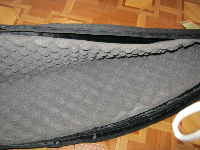 Очень плотная ткань, сбоку четыре маленьких кармана, и один большой, внутри поролон.