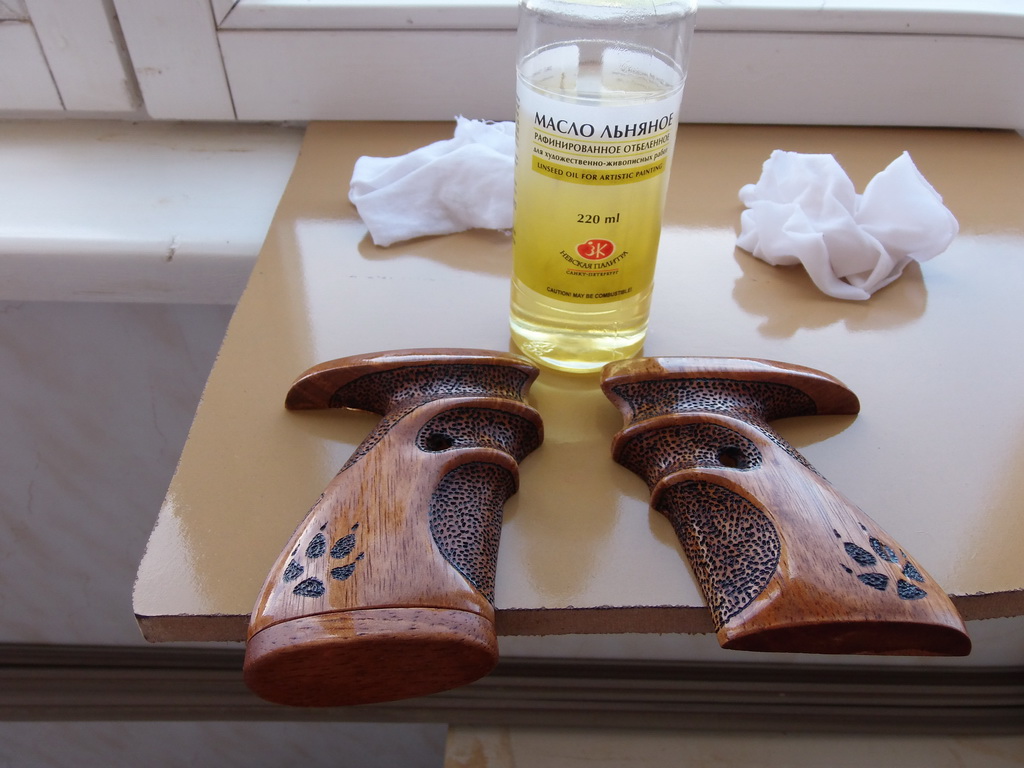Получив инструкции из Интернета хорошенько промасленные накладки оставил сохнуть в подвешенном состоянии на 3 или 4 дня.После нанёс с периодичностью в сутки ещё 3 слоя.Вытер излишки(масло уже на 4 слое практически не впитывалось) подвесил на балконе и сушил неделю.Всё высохло здорово.Вот такой стала рукоятка после льняного масла