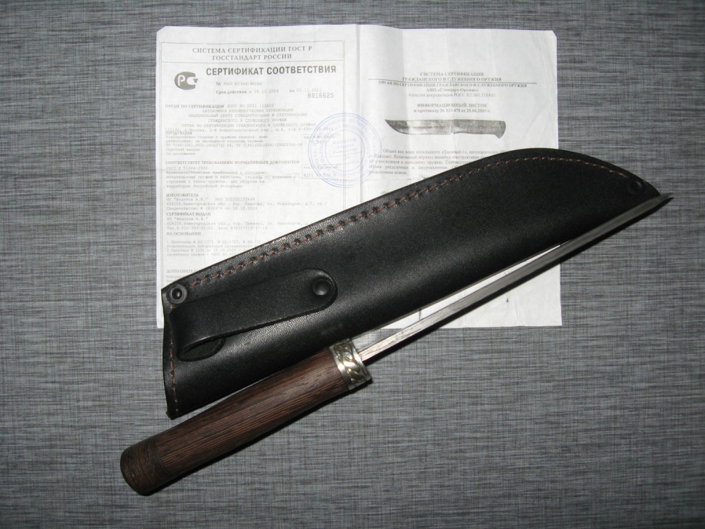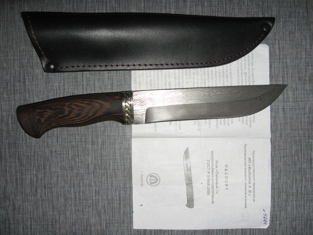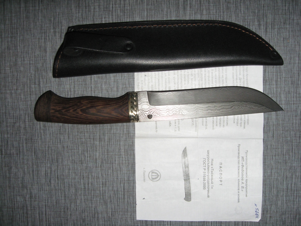 Нож шкуросъемно-разделочный, мастерская А.Федотова (Павлово). Многослойный дамаск, рукоять венге и мельхиор. Паспорт. Клинок 170Х36Х4,5. Ножны кожа, пропитанная воском. Один раз брался на шашлык. Бреет.