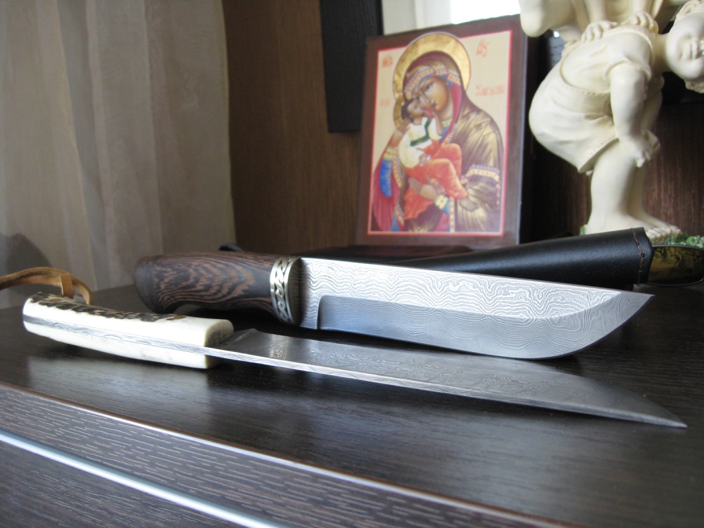 Iskander писал(а):Нож шкуросъемно-разделочный, мастерская А.Федотова (Павлово). Многослойный дамаск, рукоять венге и мельхиор. Паспорт. Клинок 170Х36Х4,5. Ножны кожа, пропитанная воском. Один раз брался на шашлык. Бреет.