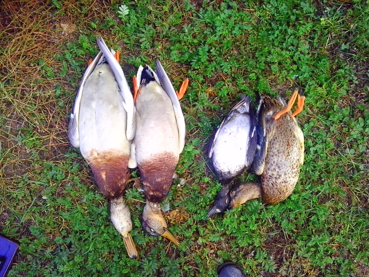В итоге, в пятницу вечером взяв другу разовую путевку, отправились в угодья на разведку, ну и ознакомление с местами предстоящей охоты. Хоть и в небольшом количестве но утку мы увидели, и это придало немного уверенности что завтра повезет. В субботу затемно мы уже были на месте, готовые к действиям. Согласно ранее разработанного плана, решили в начале прочесать мелиоративные каналы. Проходя вдоль первой же, удалось поднять стайку уток голов на семь-восемь, но из-за тумана и неожиданности (взлетели сзади после нашего прохода) добыть нам их не удалось. До обеда протоптали мы не один километр по полям, были подъемы уток, в основном одиночки, но в тот момент фарт был не на нашей стороне и настроение начало падать с каждой минутой. Еще как назло и дождь начал моросить. Посовещавшись решили попытать счастье на небольшой речушке. По ка добирались до места, дождь начал лить как из ведра, что как понимаете не способствовало поднятию нашего настроения. Прождав в машине пару часов, пока погода позволит нам еще немного поохотится, двинулись по реке разным берегам. И вот здесь нам выпал шанс, который мы не упустили, на изгибе реки у камыша была замечена небольшая стайка копошащихся уток. Такой шанс мы не упустили, добыли трех штук, двух селезней и утку. Успокоившись и собрав добычу из прибрежного тростника, двинулись дальше, и не зря. Буквально через пятьсот метров другу посчастливилось снова, сначала услышал, а затем и поднял парочку крякв. И как финал, точным выстрелом добыл себе ещё одну утку. В итоге, впечатлений и эмоций за один час было получено выше головы. Вернувшись к машине, мы не успели сделать и по пару фоток, как снова линул дождь. На этой ноте решено было охоту закончить, и переместиться в более подходящее место. Но это совсем другая история :-) :-) :-) .....