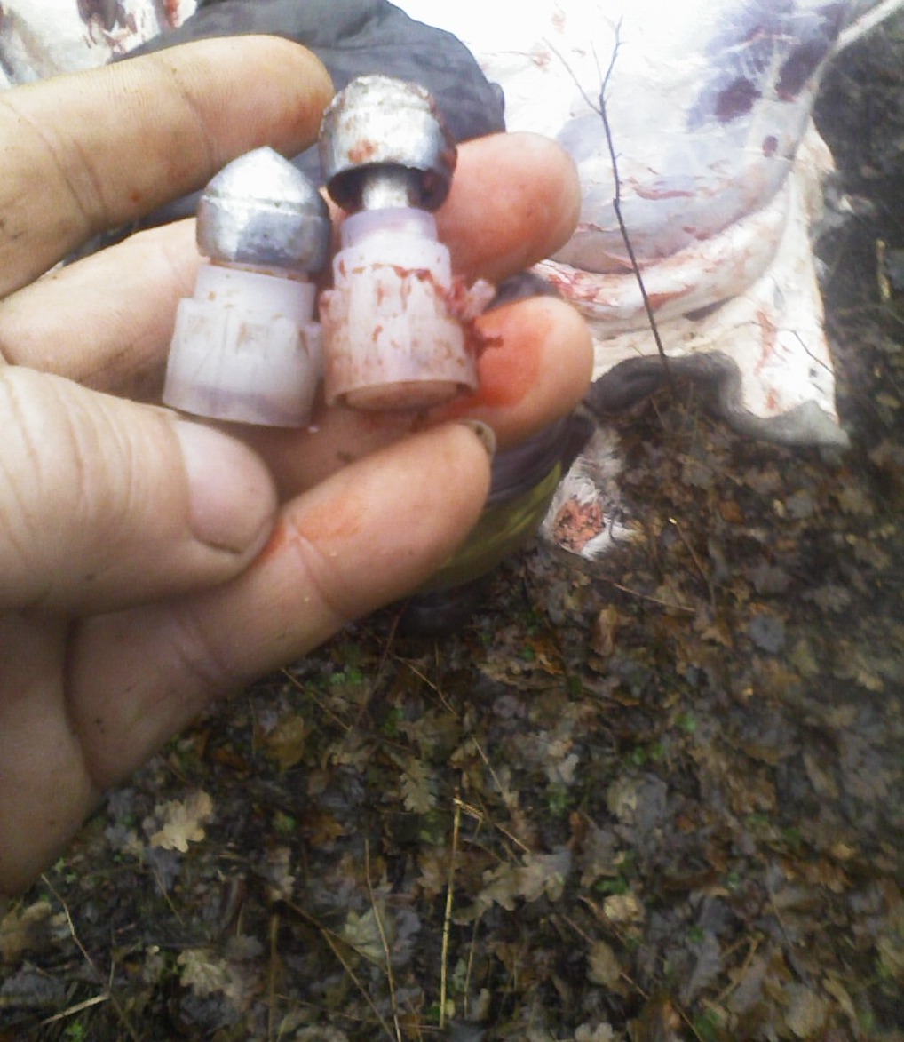 Первый лось. Полева. Все под лопатку. Одна навылет, две застряли на выходе под шкурой, явно излишне твердые.