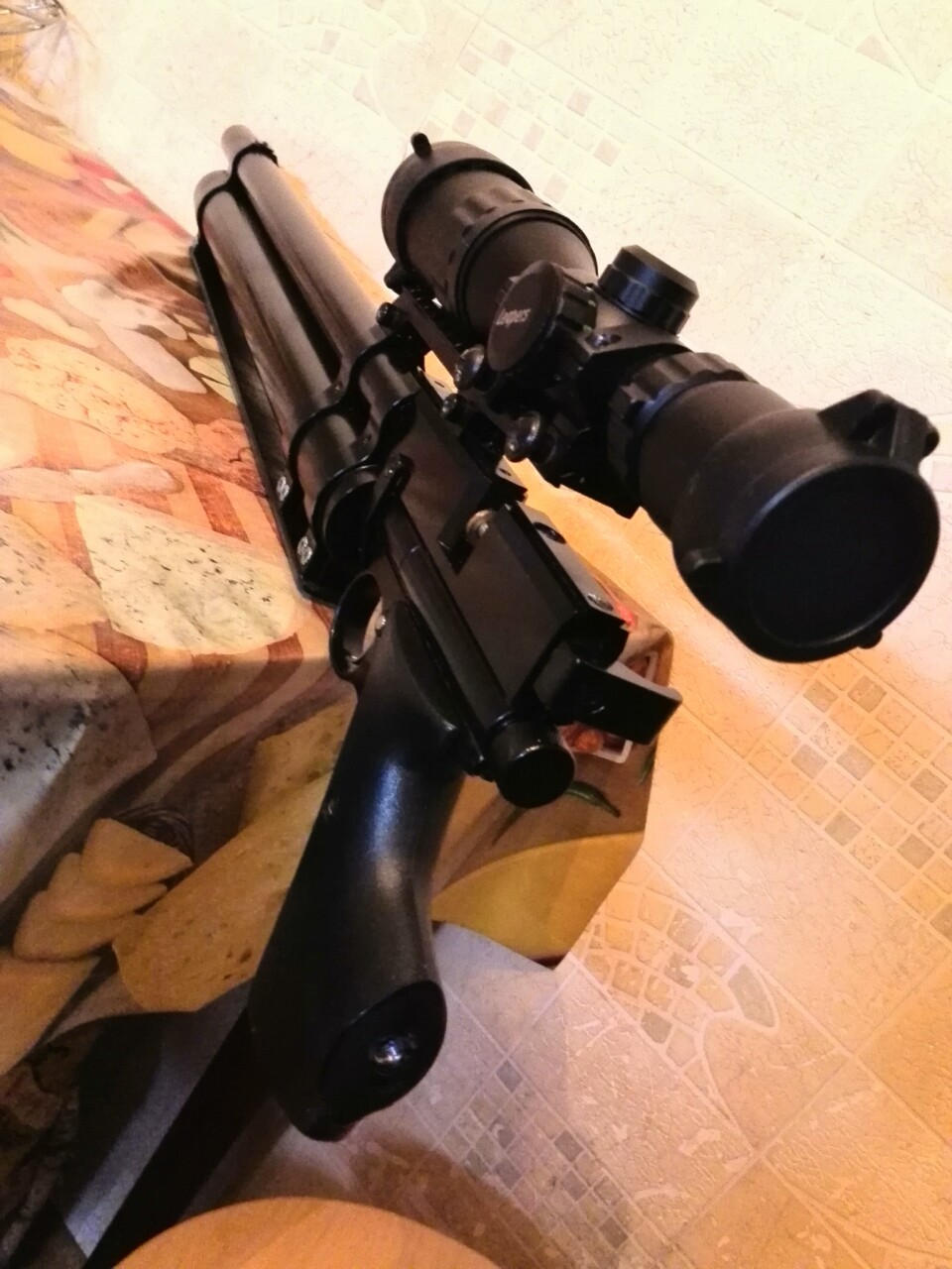 Кит крюгера. Резик 430, редуктор стандарт,дудка CZ 420мм,в модере 2увеличенных и 5обычных стаканчиков. Усм-от алмаза. Злая пружинка ударника,из стали которая долго не дает усадку(покупал у профессора). Прицел липерс 3-9×32. 1-барабанчик. Есть деревянные щечки на рукоятку. С 250 до 140- 60стабильных выстрелов JSB 1.175 со скоростью **90м/с.