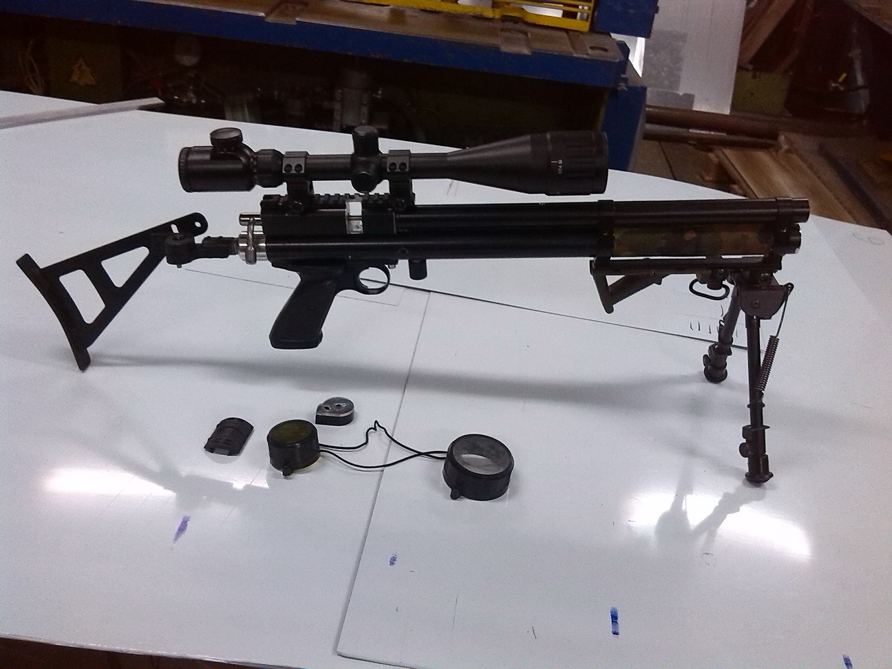 Пистолетокарабин от мастера АСС79. Выпуск 2014 г. Ствол кроссман 5.5 длинна 30 см. Длинна карабина в сложенном состоянии 67 см. Складной приклад AlbertTag, 2 восьмерки на планке вивера с тактической ручкой и антабкой для ремня, резиновая накладка на вивер. ОП таска 6-24Х50 AOE арбалетная сетка. Барабанчик на 10 камор. Состояние хорошее, стреляет, попадает. Давление держит, манометр светится в темноте исправный и точный (показания совпадают с ЗС). Средняя скорость из десяти выстрелов пулей 0,93 гр. равна "55. Заправляется до 220. Стреляет с 220 до 130(можно ниже но уже не так мощно) полноценные четыре барабашки. Ручка взвода очень удобная и позволяет стрелять не отвлекаясь от цели. На кучу не отстреливал.