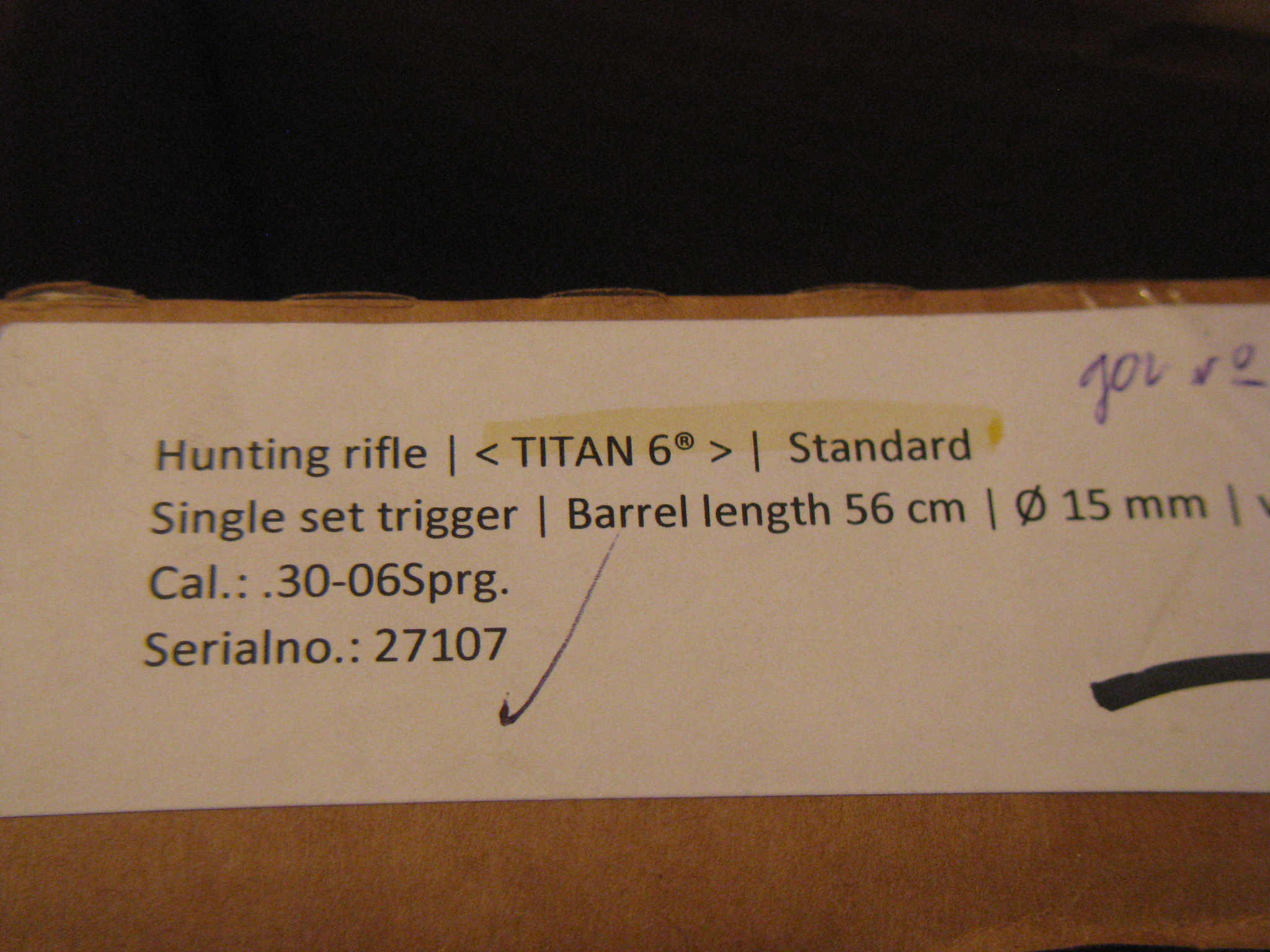 Продам новый карабин Титан-6, Австрия, в дереве (орех), со сменным стволом, длинна стволов 56 см., вес 2800 г., калибры 30-06 и 243. Ввезен из РФ, крепление для оптики не устанавливалось, в пути (Recknagel для Rößler Titan, планка Weaver/Picatinny высота 6,5 мм), руководство по эксплуатации на русском языке, шнеллер, золотой спуск, предохранитель в 2-х положениях, ключ, сменные антабки. К 243 стволу 5 пачек патронов. Все комплектом. Цена 53 000 000 рублей.