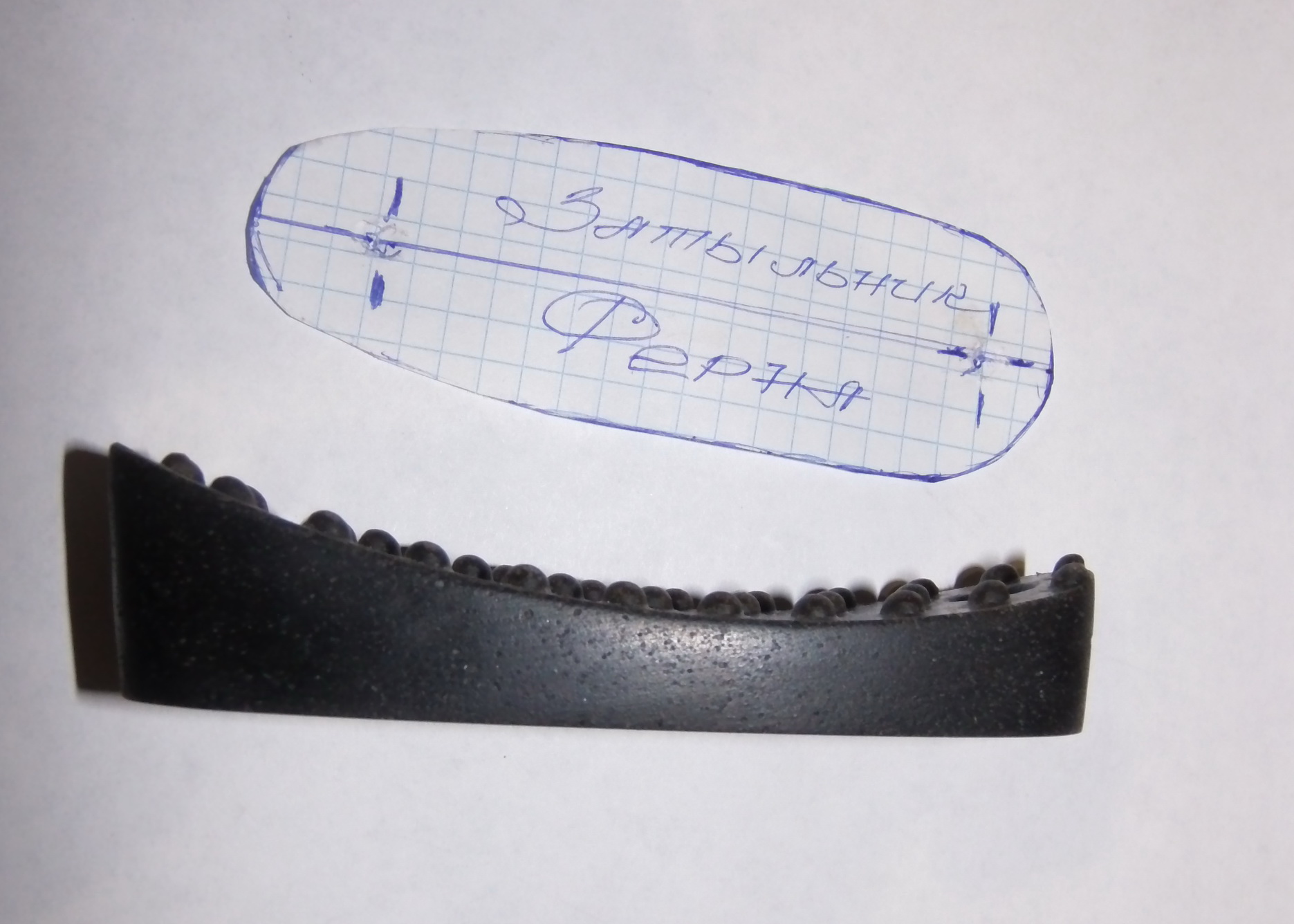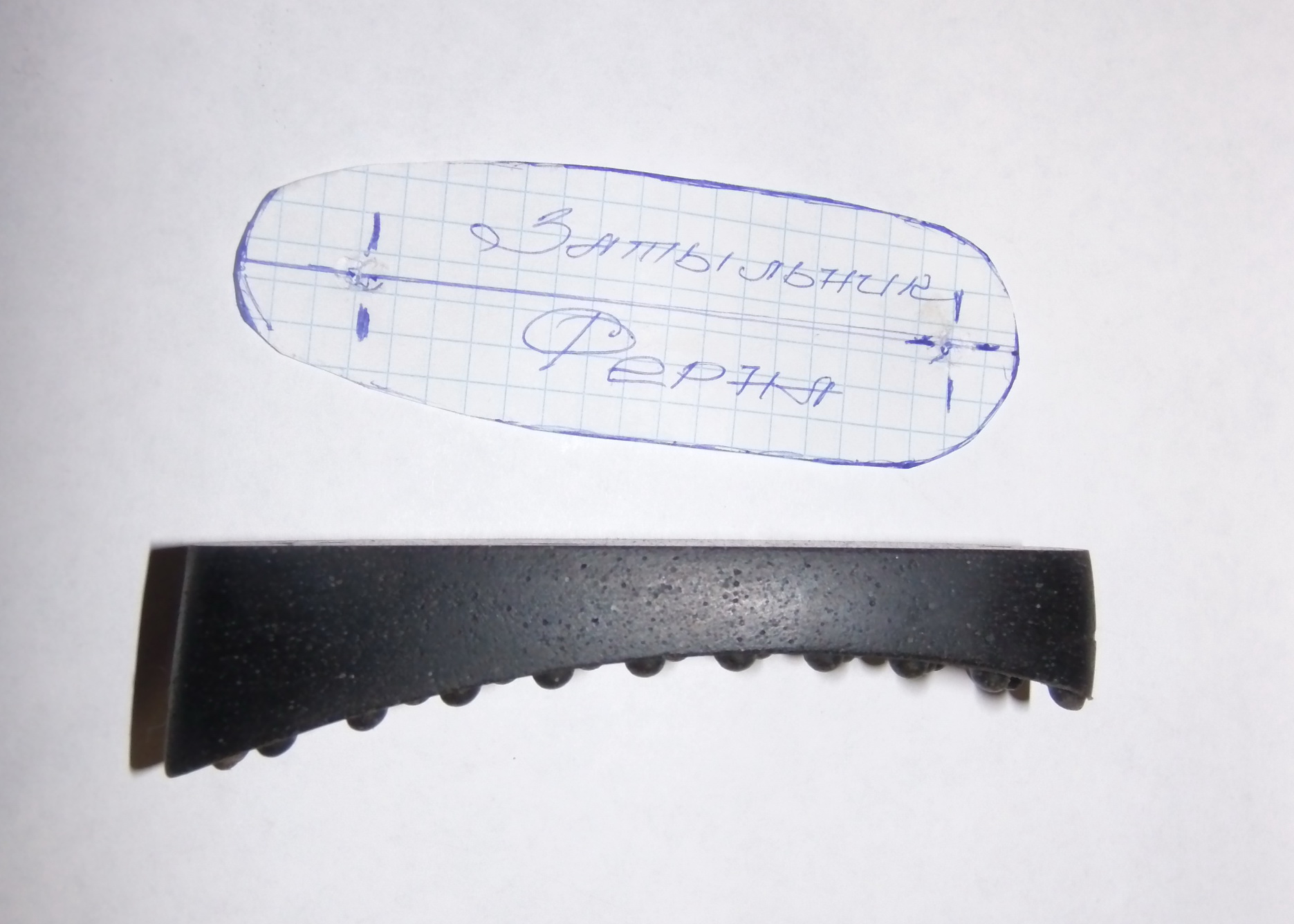 В затыльнике есть даже вкрапления металла в резине.Смотрится вообще здорово!Олег толковые вещи делает,в который раз убеждаюсь!Процесс длился минут 30.Немного наждака,крупный напильник,мельче,наждачка от средней до мелкой.В верхушке при стачивании открылась влитая в затыльник шайба под винт или саморез.Я говорил,что довольно высоко отверстие будет.Но там всё хорошо-шайба влита намертво,не выскочит!И прикрутишь его надёжно к прикладу-я думал будет хуже.После обработки думал загрунтовать слегка и задуть краской легонько...Оказалось как нельзя проще-мочишь палец в 646-0й растворитель и проводишь по обработанному.Получается КАК БАБУШКА ПРОСИЛА!!!