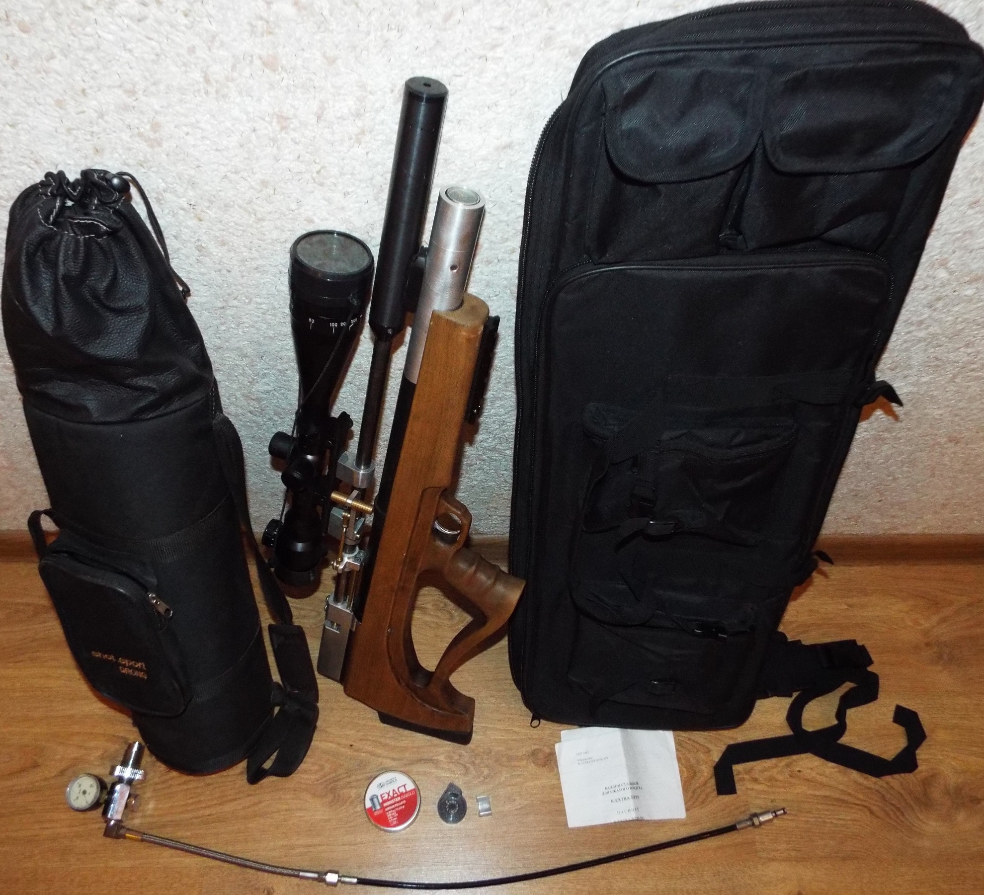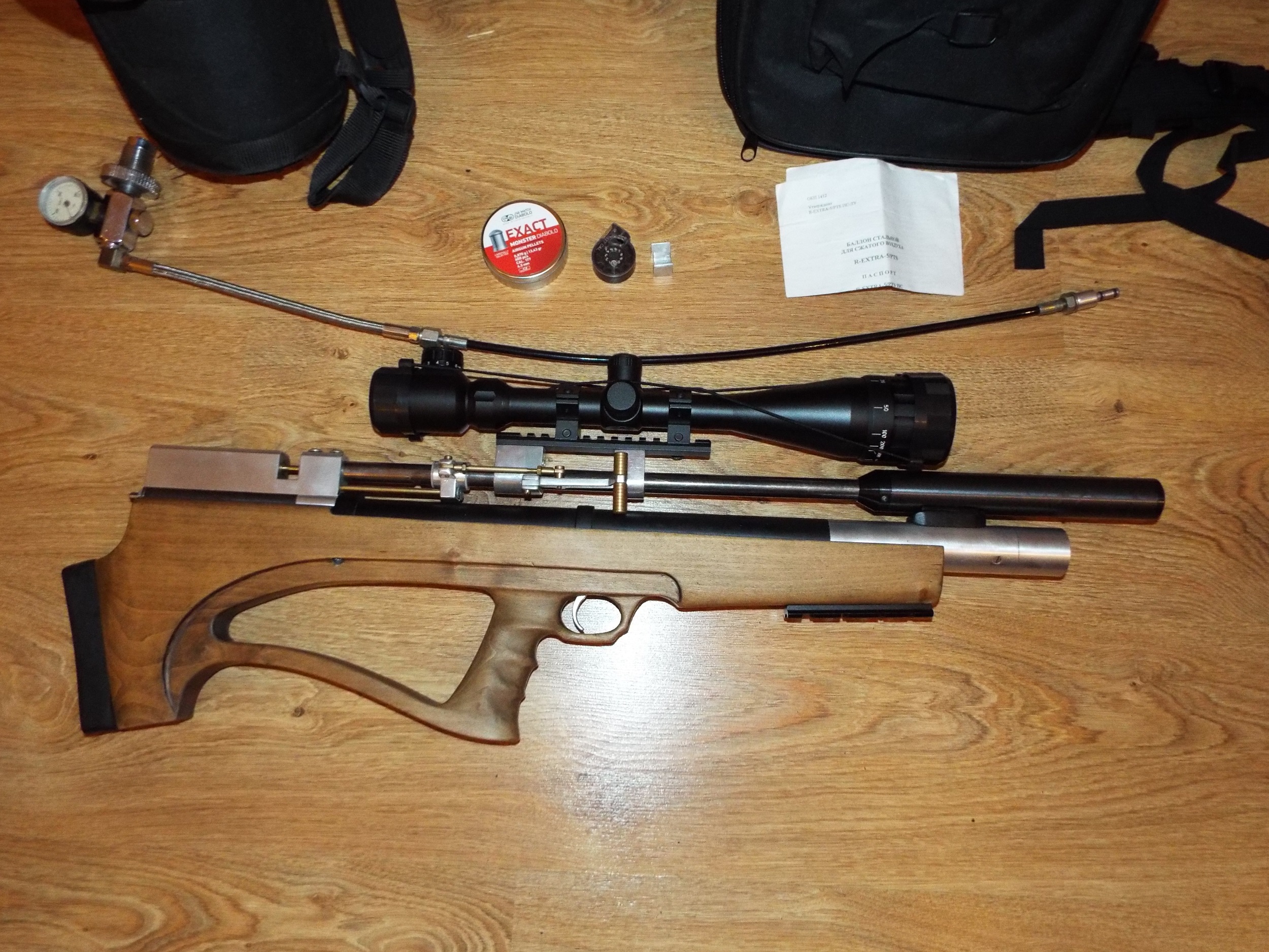 В комплекте булка редукторная, многозарядная, с чехлом, прицел кондар с подсветкой 6х24х50 с кольцами, баллон r-extra 6.8 л. производства февраль 2008 г. с чехлом и документами, ЗС, многозарядный магазин, лоток для одиночной стрельбы, пол банки монстров. Короче все что на фото.