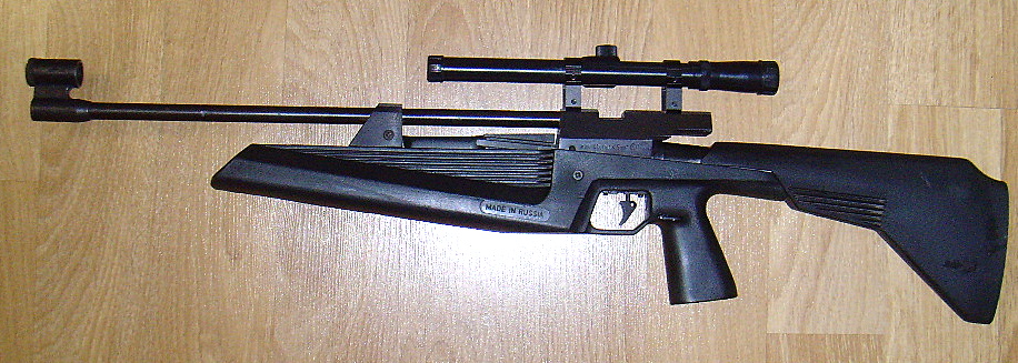 Отсутствует винт регулировки длины приклада, прицельная планка, мушка, пластмассовая заглушка приклада со стороны плеча.