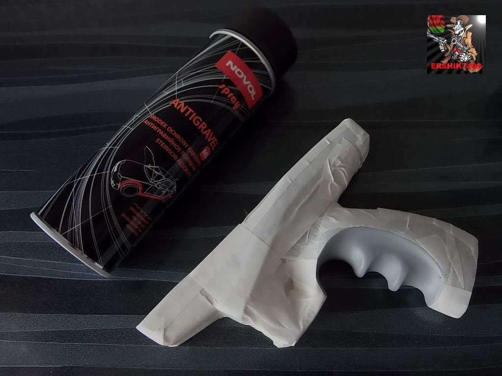 Как Вы видели на эскизе,в выемках под пальцы на рукояти была этакая пористость.Также были такие пористые элементы нарисованы и на боковинках.На рукоятке это планировалось сделать для того,чтобы при охвате её она была не скользкой,а на боковинках это был всего лишь антураж.Думалось сделать это выжигателем или приспособой для наколотки,которую давно сделал из большого болта с помощью трёхгранных надфилей.Но когда дошёл до этого этапа,решил-на боковинах эти "навороты" станут лишними.А вот с рукоятью решил действовать с риском запороть всю работу.Пришла на память идея применить для этого автомобильный антигравий.Только не тот,который ложится как краска ровным слоем,а мелкозернистый противоударный.Он как раз и должен был сослужить добрую службу.Конечно несколько стрёмно было работать с материалом,с которым в столярных идеях не сталкивался...В общем купил в том же автомагазине нужный антигравий."Гравекса" не было,но был "NOVOL-antigravel spray". Его и взял.Ложа была уже загрунтована,аккуратно оклеил по предусмотренной грани малярным скотчем,чтобы не загадить где-то ещё ложу,обернул скотчем и остальное:
