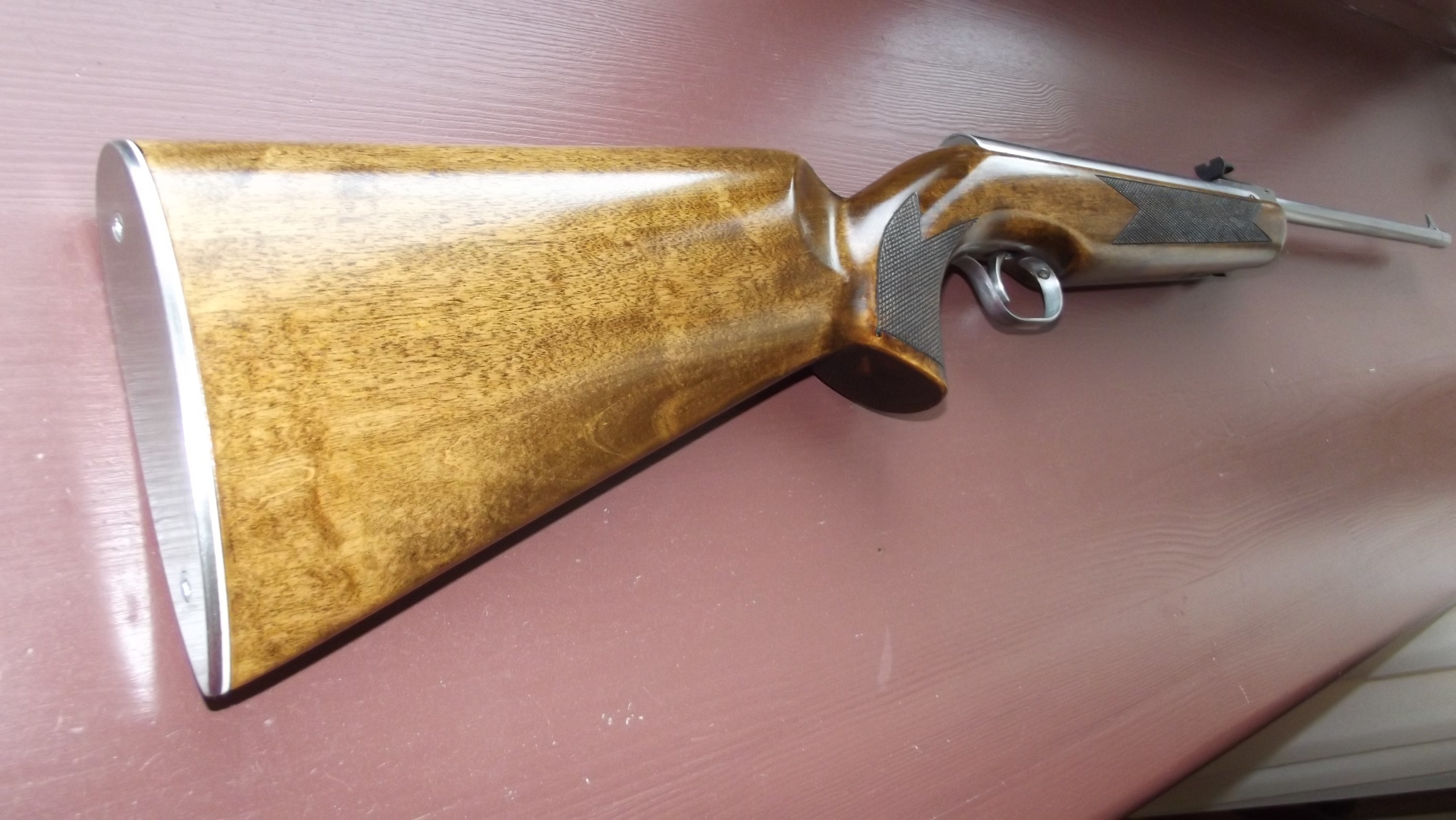 Все вылизано и доведено до ума - ничего пилить не надо: расточен и перенесен задник, полирован цилиндр, поршень под пластиковую манжету от мр 512, манжета с герметиком, утяжелитель поршня, перепуск 3,5 мм, короткий и мягкий спуск, приклад береза, насечка, пропитка воск, затыльник и курковая скоба из нержавейки.