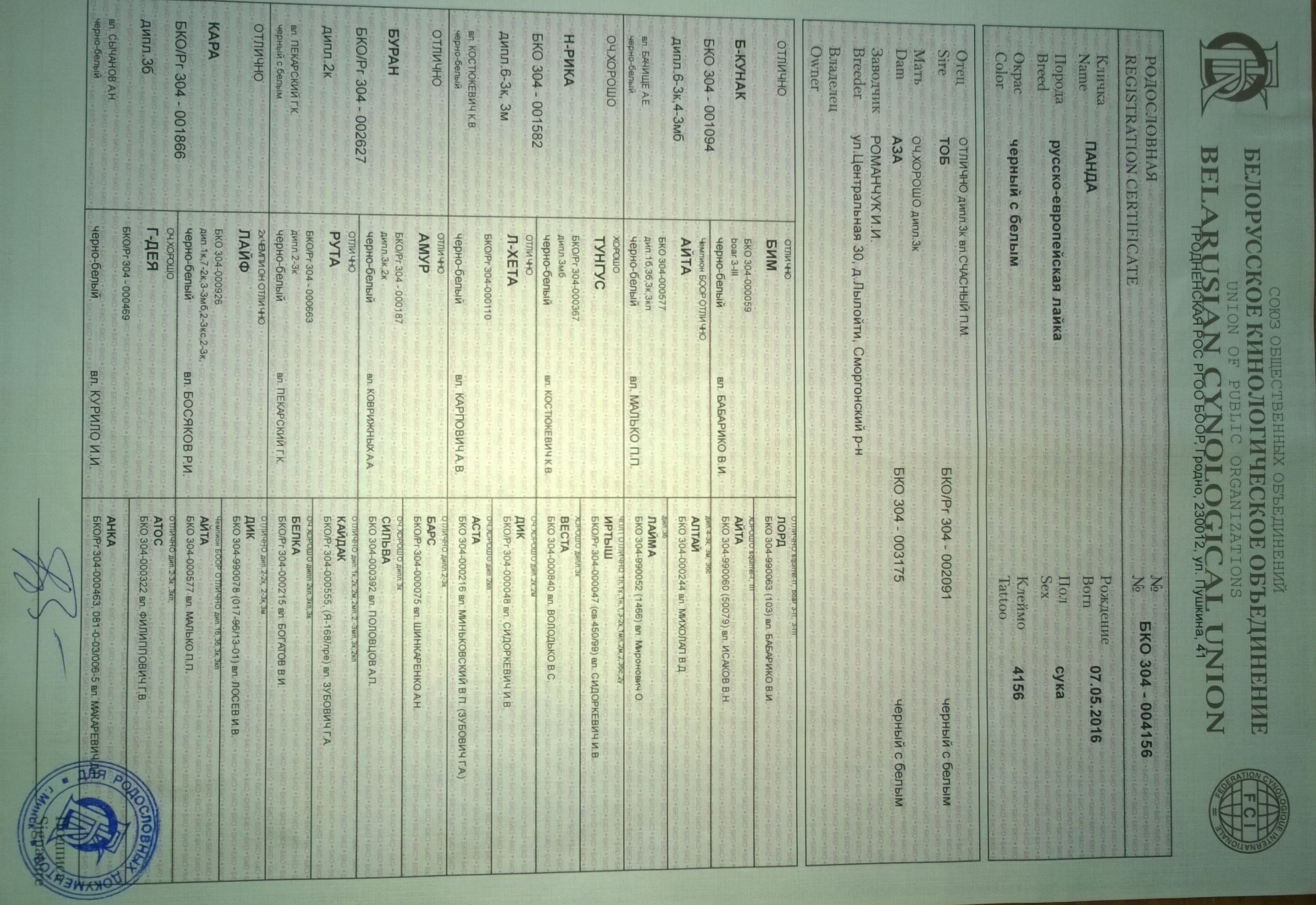 2.2.1 Кличка, номер родословной, фотография родословной с двух сторон.