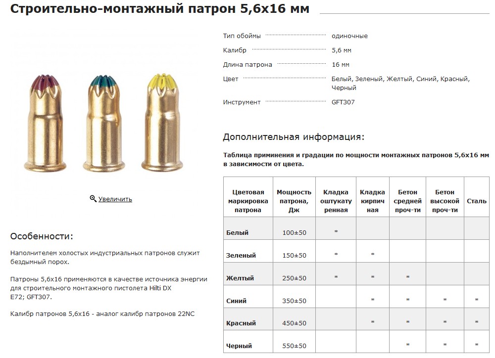 Боеприпасы: строительные патроны калибра 0.22NC (5.6 x 16 мм)