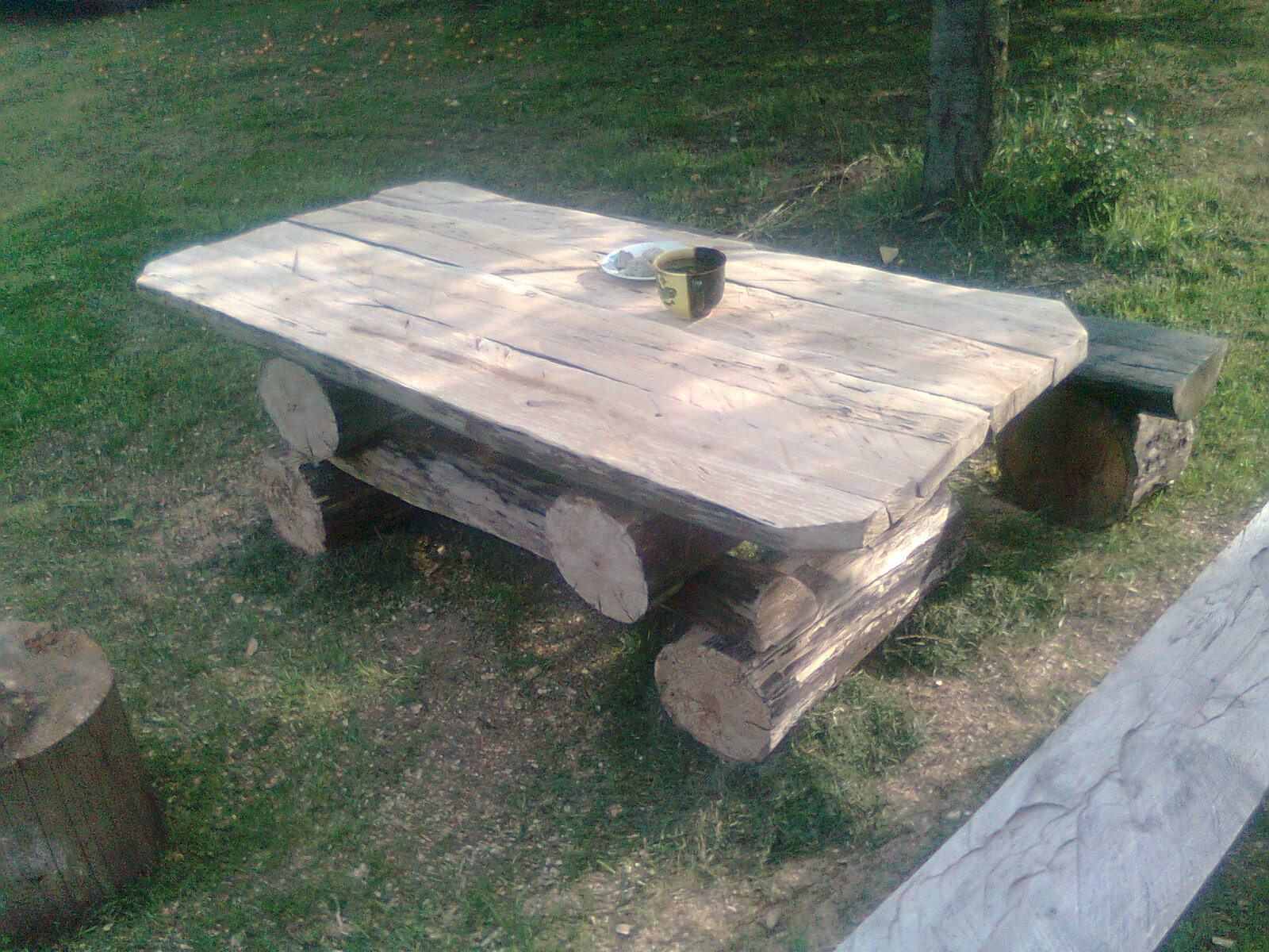 . Повторить столь интересные проекты ни времени ни сил не было , но жена уж второй сезон требует садовый столик для чаепития и т.п. Поэтому вооружился любимым Штилем , выкатил во двор 6-ти метровое брёвнышко , потратил полтора часа личного времени и вот что получил :