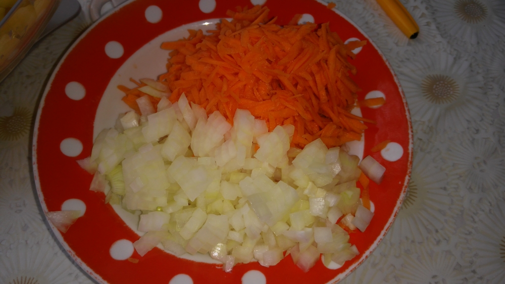 Заливаем кастрюлю четырьмя литрами воды и ставим на огонь. В то время пока закипает вода, судорожно (так как охота есть :-) ) чистим две морковки и трем их на крупную терку, чистим лук и режем его на мелкий кубик, шампиньоны моем и режем продольно.