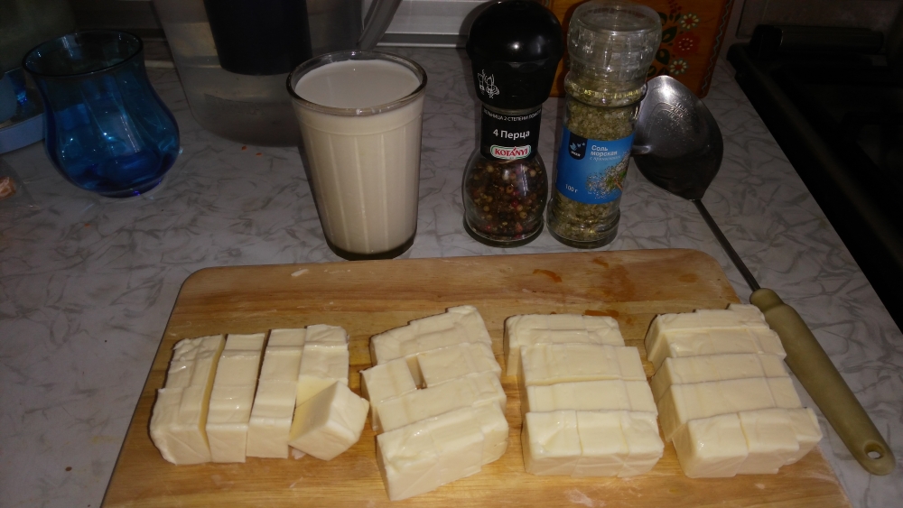 За эти десять минут, пока варится наш супец, берем 4 плавленных сырочка и режем их кубиками. Их будет проще порезать если они будут хорошо охлажденными, а нож смочен водой. Наливаем граненый стакан сливок, а оставшиеся в пакете с удовольствием как кот выпиваем :-) !