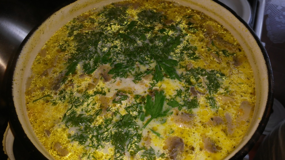Когда наш суп поварился после заброса грибной зажарки, аккуратно двумя руками, по кусочку добавляем четыре плавленных сырка, и после заброса всех, помешивая, выливаем сливки. После того как Вы добавили сливки, суп лучше помешивать постоянно, для того, чтобы растворился сыр. Доводим до кипения, варим 5-7 минут, одновременно добавляем перец, специи и соль по вкусу. В моем случае это была смесь четырех перцев и морская соль с травами.