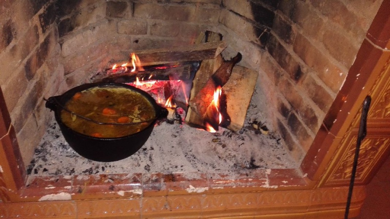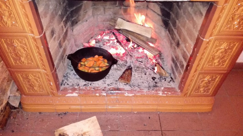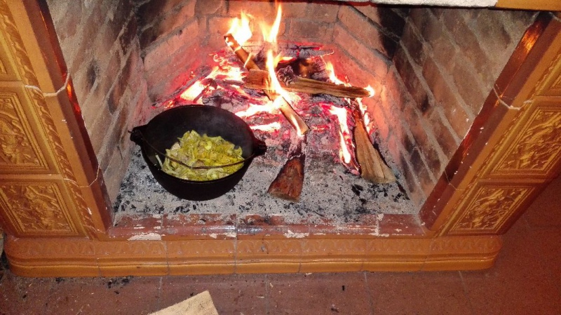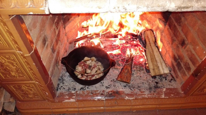 в камин ставится казан, и ждем когда казан раскалится хорошенько,