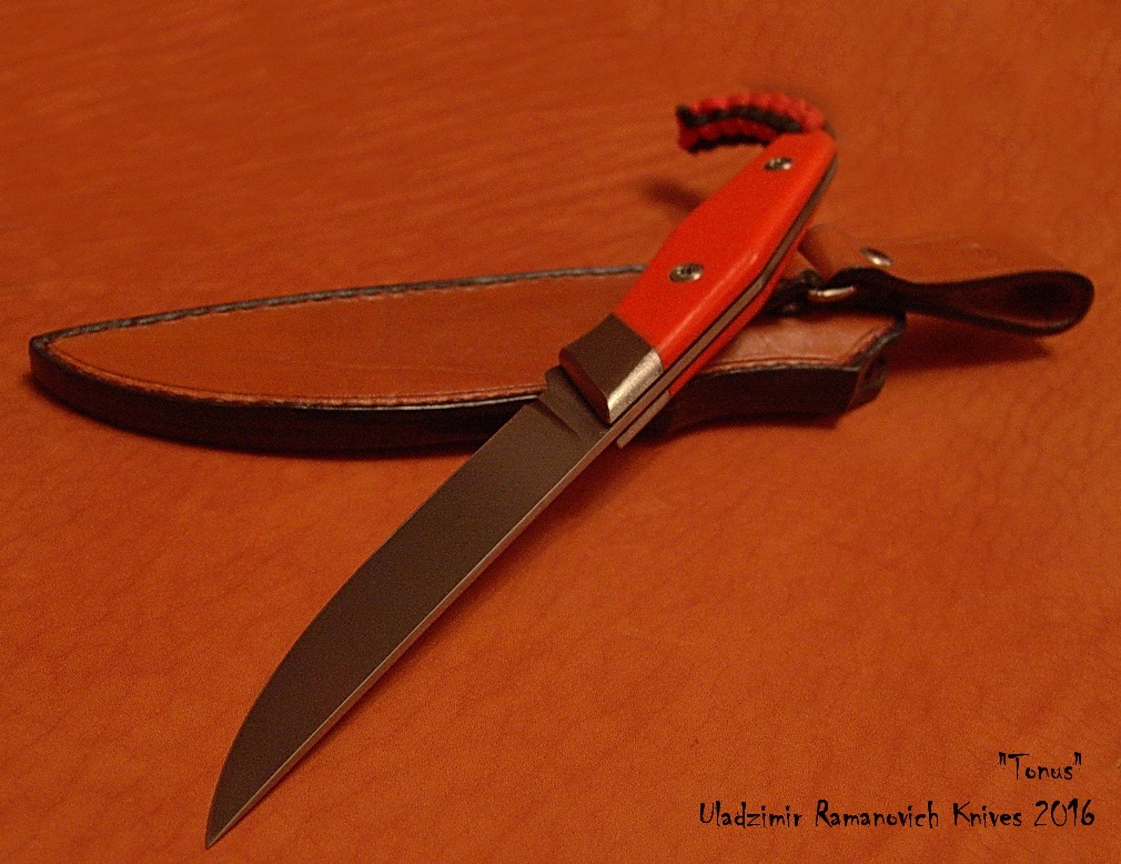 Нож "Тонус", клинок: сталь CPM S90V, твёрдость 60-61 HRC (крио), длина клинка 122мм, ширина 26мм, толщина 2,7мм, галтовка. Рукоять: длина 123мм, оранжевая G10, больстер: титан, винты: нерж. исправленные по геометрии. Ножны - кожа. Цена 425 руб., тел. +375-25-738-90-48, Владимир