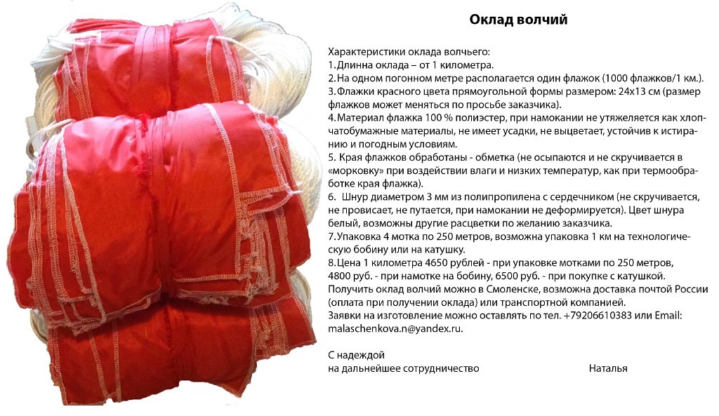 Дорогие охотники! В преддверии нового года хочу вас поблагодарить за приобретение и распространение информации о моих окладах волчих (флажков для охоты на волка). Благодаря вам в 2017 году я поставила флажки на волка более 100 охотничьим хозяйствам России, Белоруссии и Казахстана. Выполнила несколько государственных заказов по приобретению окладов на волка в России и Белоруссии. Были заказчики приобретавшие флажки на волка для охотничьих хозяйств Евросоюза. Очень приятно получать от вас положительные отзывы о производимых мной окладах волчих, а так же рекомендации по совершенствованию производимой мной продукции. Так в начале года на основании ваших предложений мы модернизировали катушку для намотки оклада флажков на волка. Учитывая, что охота на волка – это загонная охота, а безопасность на таких охотах, прежде всего, в 2017 году я начала производить линейку сигнальной одежды для охотников.
