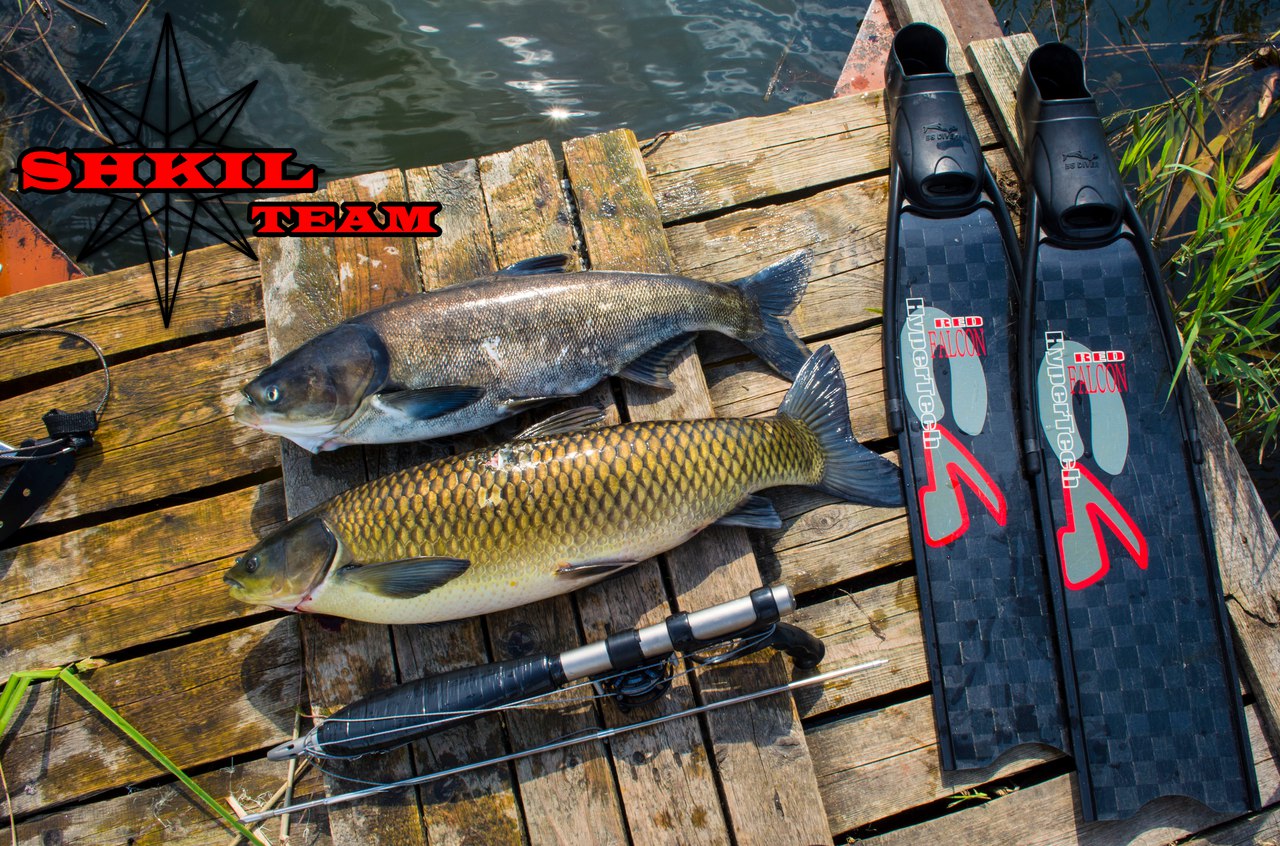 Саша и я расходимся в разные стороны. Первые нырки подтверждают наши догадки по прозраку. Для начала лучше всего использовать активный поиск, но не долго. Если в течение первого часа вы понимаете, что он не приносит успеха, то необходимо начинать лежать в лёжках за всякого рода укрытиями. Корчи, бровки, камни, кусты водорослей. Средняя глубина водоёма 3-5 метров, начал я с залёжек на 5 метрах и лежал на задержке дыхания по 1.5 - 2 минуты. Рыбы нет. Полчаса - и смещаюсь на 3-3.5 метра, начинаю прятаться в кронах водорослей, слегка выглядывая из них так, чтоб только кончик гарпуна выглядывал наружу. Лежу долго, и перед тем как всплыть замечаю проносящийся мимо меня крупный силуэт Толстолобика (его форму трудно с кем-то перепутать). Выстрелить не успеваю, потому что пронёсся он мимо меня как ракета. Ясно. Горизонт охоты выбран правильно, нужно искать на этих глубинах, но быть предельно внимательным и осторожным. Еще некоторое количество заныров и лёжек - и на меня выходит толстолобик, довольно крупный. Выждав нужный момент для наиболие вероятного попадания, делаю выстрел из ружья Олега Коровинского. 60 см, закачка в районе 25кг. Гарпун шьёт навылет и толстолобик уходит в сторону. Несколько крепких рывков - и я смело подтягиваю к себе рыбу. Толстолобик весом 7кг. Предварительно усыпив, вешаю рыбу на кукан.