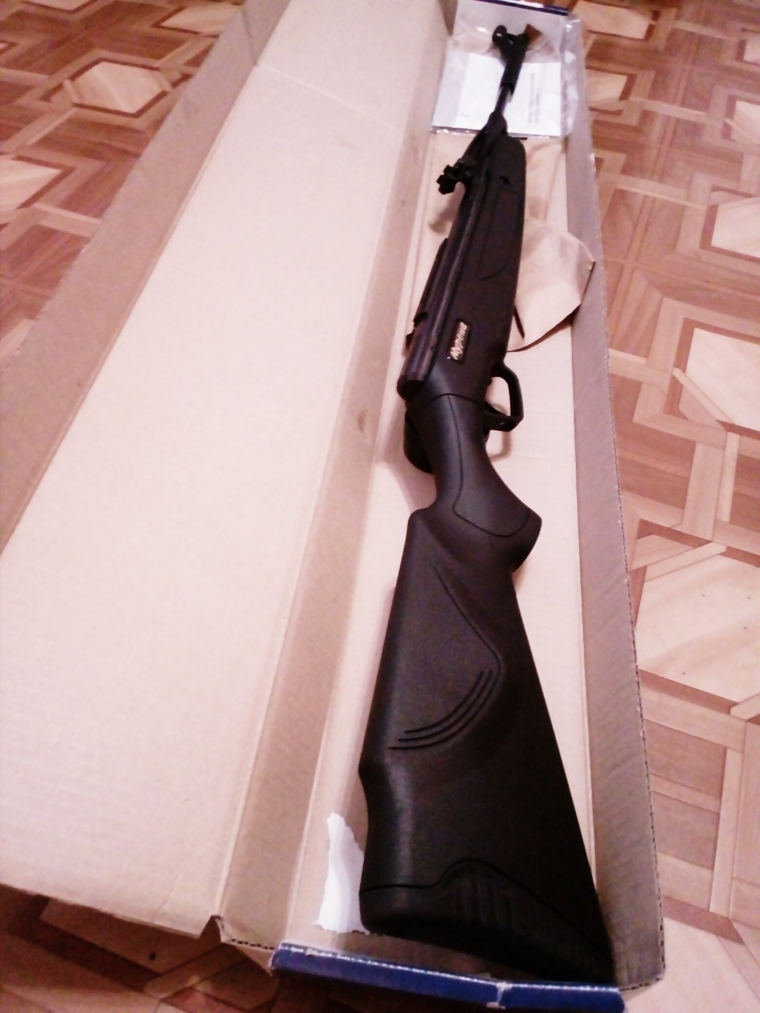 Компрессор 100мм,ход поршня 85мм. Длинный поршень. Укоротить поршень на 15мм и будет ход 100мм. Но она и так 05г выдаёт **20 Перепуск поставил обычный, был 2мм. Винтовка не брыкучая как обычная Мурка. Спусковой крючок приятный как у иж46. Ложе тоже удобное, резиновый затыльник, крепление ложе другое, пластик добротный, толстый. Взводится без скрипа пружины, стреляет без звона.