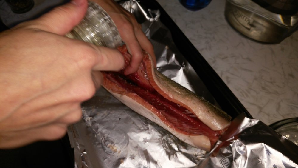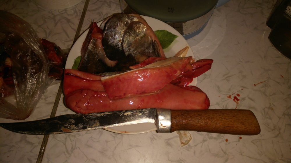 Отрезаем голову вместе с плавниками, хорошо если рыба разморожена на половину, тогда ее будет легче обрабатывать. Я всегда отступаю от верха головы, где так сказать череп, сантиметра полтора. Делаю это для того, что после ампутации головы, в крупной рыбе целыми остаются сердце и печень. И.е. они не крамсаются пополам и на части. Не откладывая на потом, сразу удаляю жабры из головы, отрезаю как кусочки от головы плавники. Кладу их в тарелку, жабры вон. Сердце и печень тоже в тарелку. Далее ножницами отрезаю верхний спинной плавник, верхний жировой и анальный с прихвостовым плавники. Брюшные не трогаю. Вспарываю брюшко аккуратно. В этот раз не повезло, икры нет, но есть огромные молоки. Извлекают их, пока мороженным удаляю все пленочки, мою под холодной водой и в тарелку к головам. Теперь когда брюшко вскрыть, там все убрано, срезаю плавники вместе с частью брюшка по всей длине не до начала реберных костей. Эти плавники с брюшком тоже в тарелку к головам. Теперь отступив сантиметра два от хвоста также его отрезаю и к головам...
