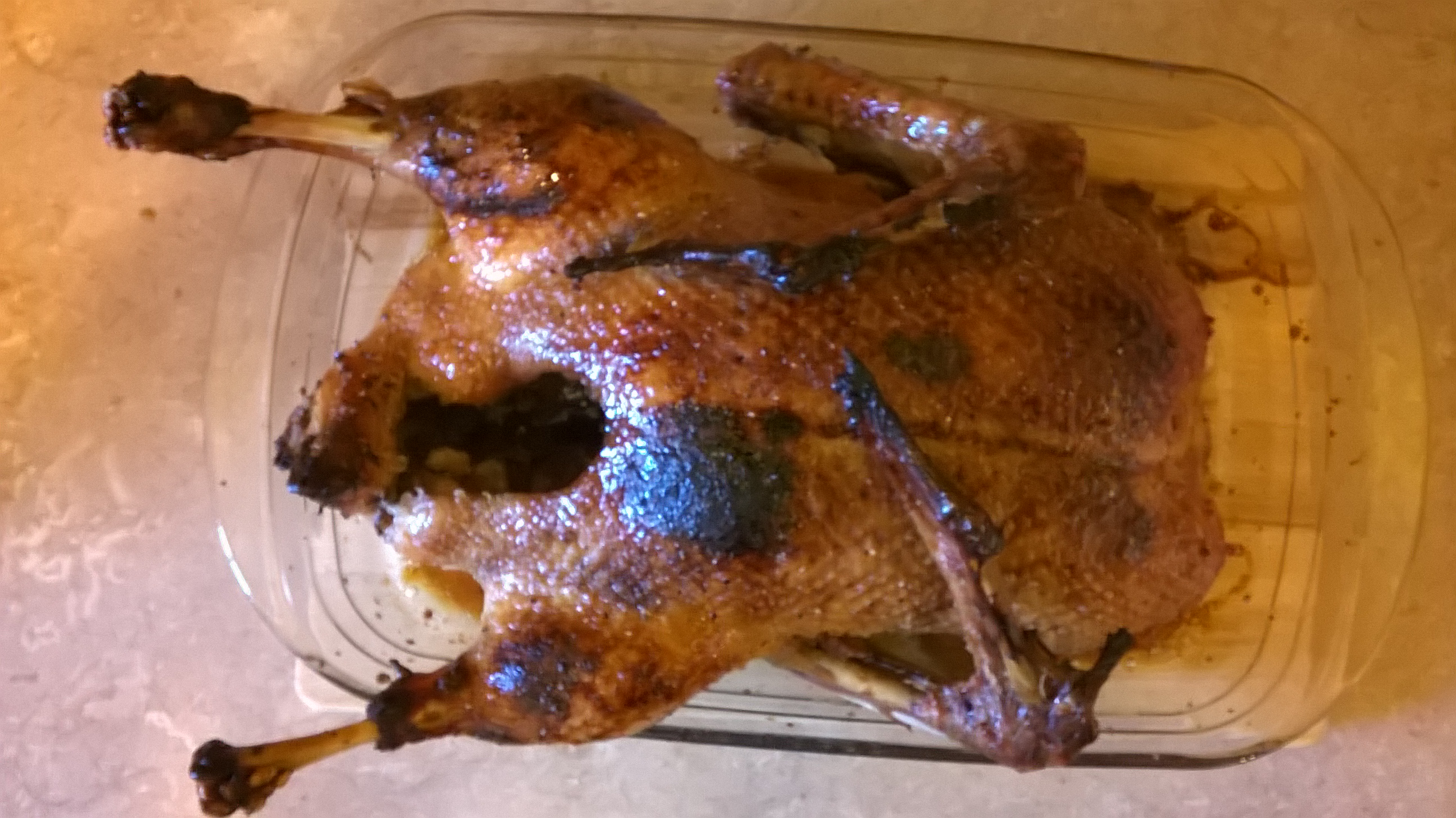 Внимаем утку из миски, укладываем в утятницу (у меня это сотейник, в другую емкость не влезла :) ) закрываем фольгой и ставим в духовку на 190С на часика полтора-два.
