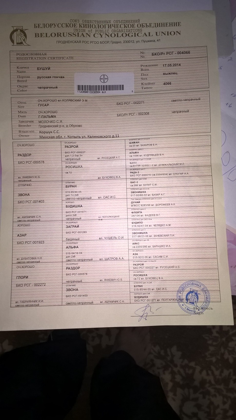 2.1.1 Кличка, номер родословной, фотография родословной с двух сторон.