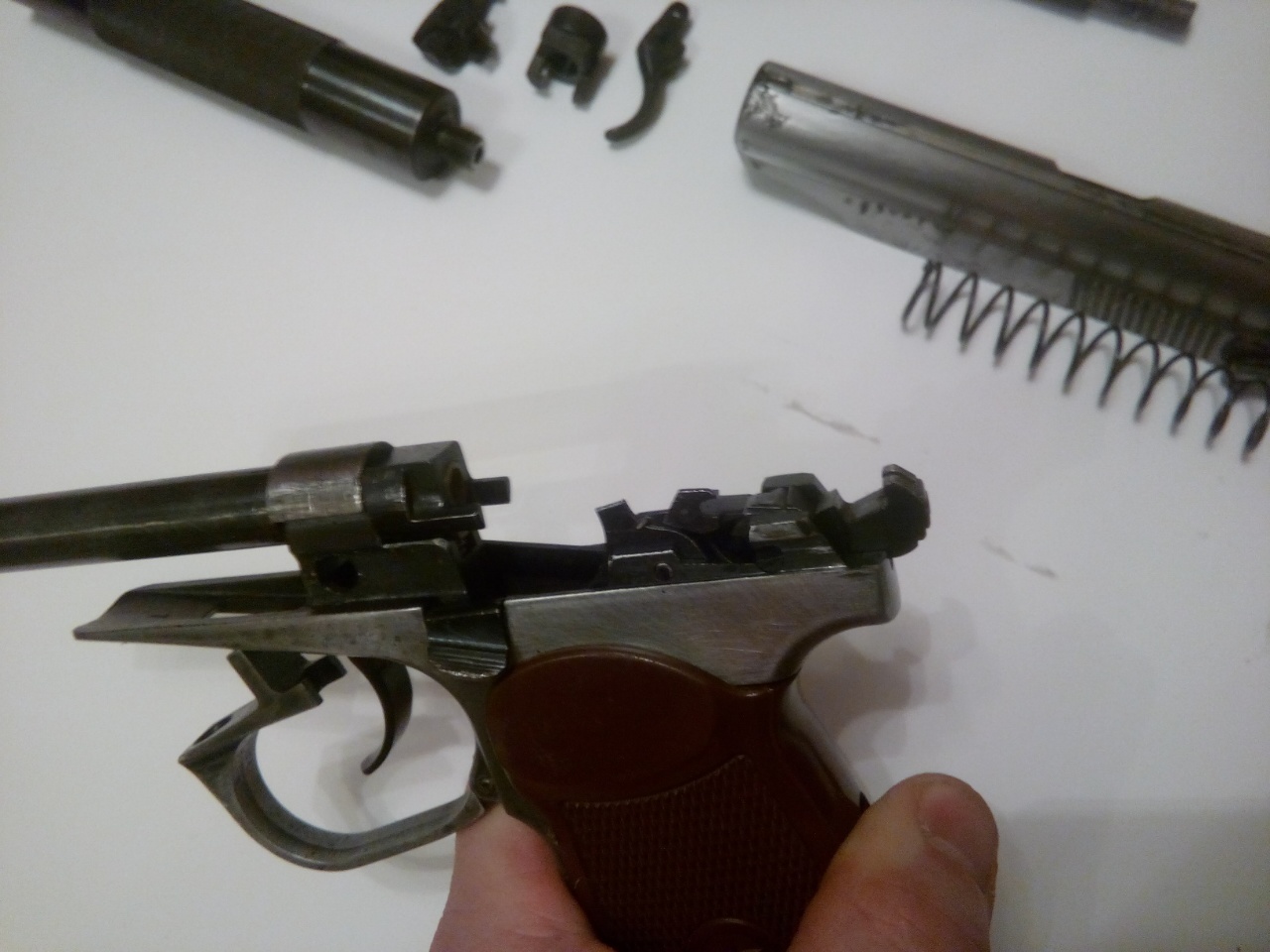 В основном пострадал затвор и родной фальшглушитель, немного рамка. Все это зачищено (на сколько возможно) и готово к воронению. Руки так и не дошли до этого. Но, все полностью рабочее и без косяков