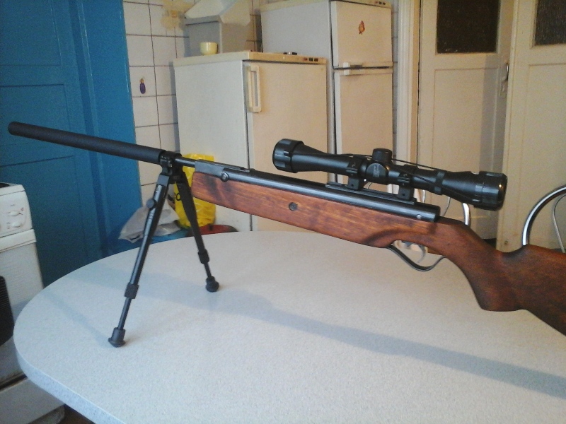 В комплекте сама винтовка, пружина Gamo hunter, сошки, оптический прицел, саундмодератор, чехол.