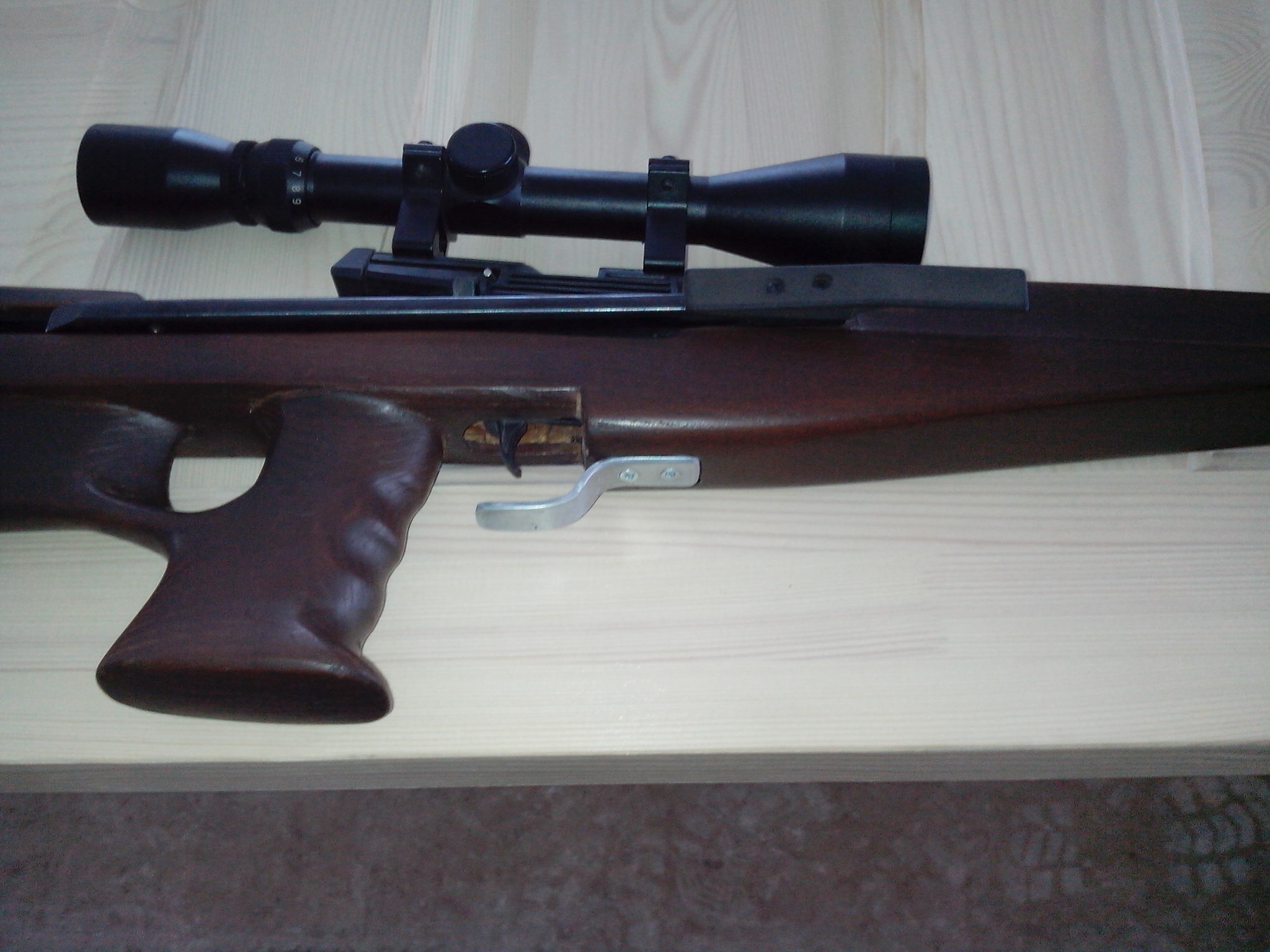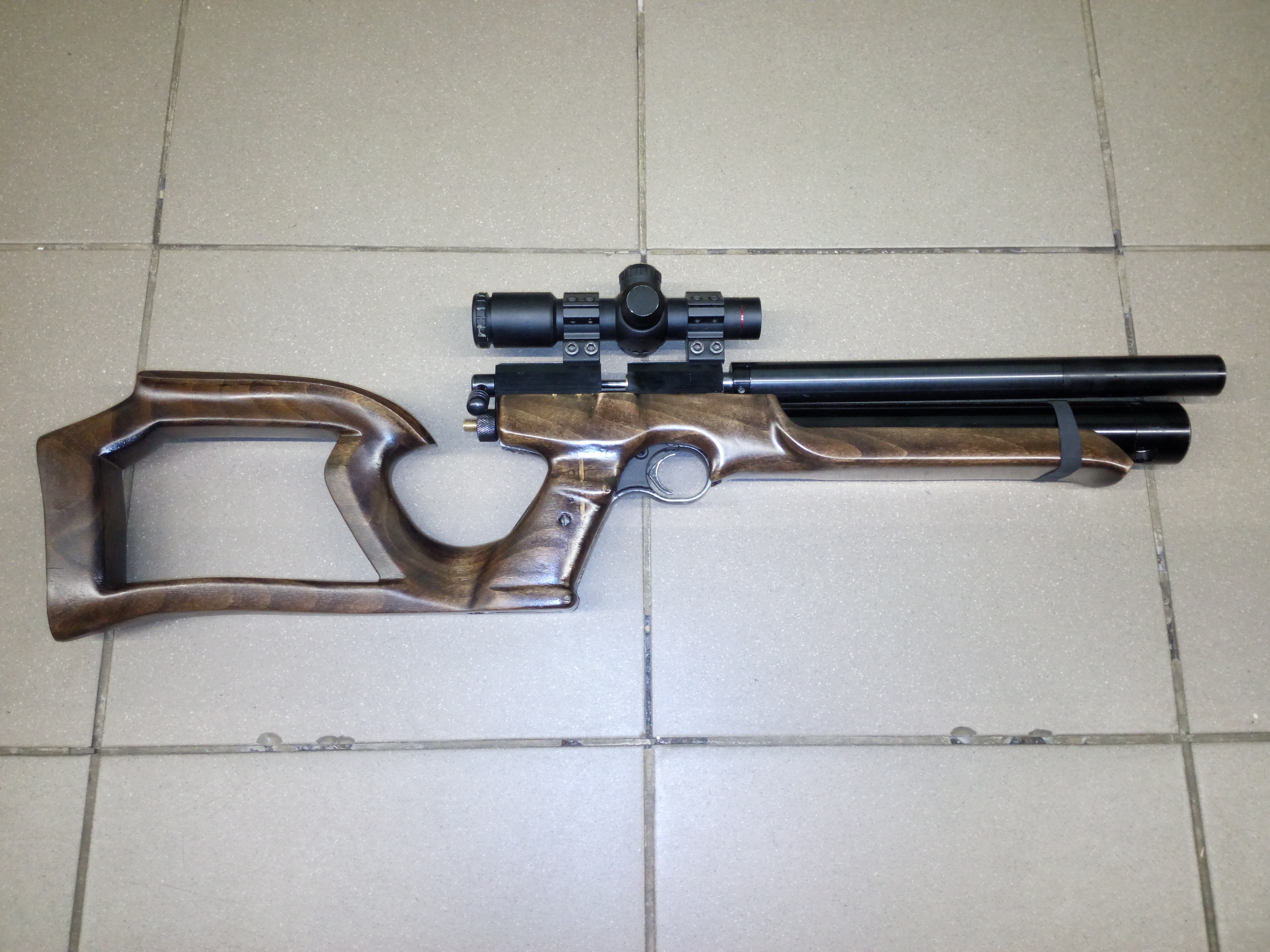 А у меня, по случаю, появился Крыс - пекаль ПСП-редуктор-cal 0.177. Тихий, кучный - с упора на 50 метров куча 25 мм Хэвиком. Решил одеть его в одёжку - сделать миникарабасик. Хотел делать приклад съёмный или откидывающийся, но на этом экземпляре в последний момент передумал. Вот что получилось. Осталось затылок из толстой кожи приклеить. Дерево бук, морилка палисандр водная + лак яхтный нанесён в несколько слоёв из пульвера. Весит меньше 0,5 кг.