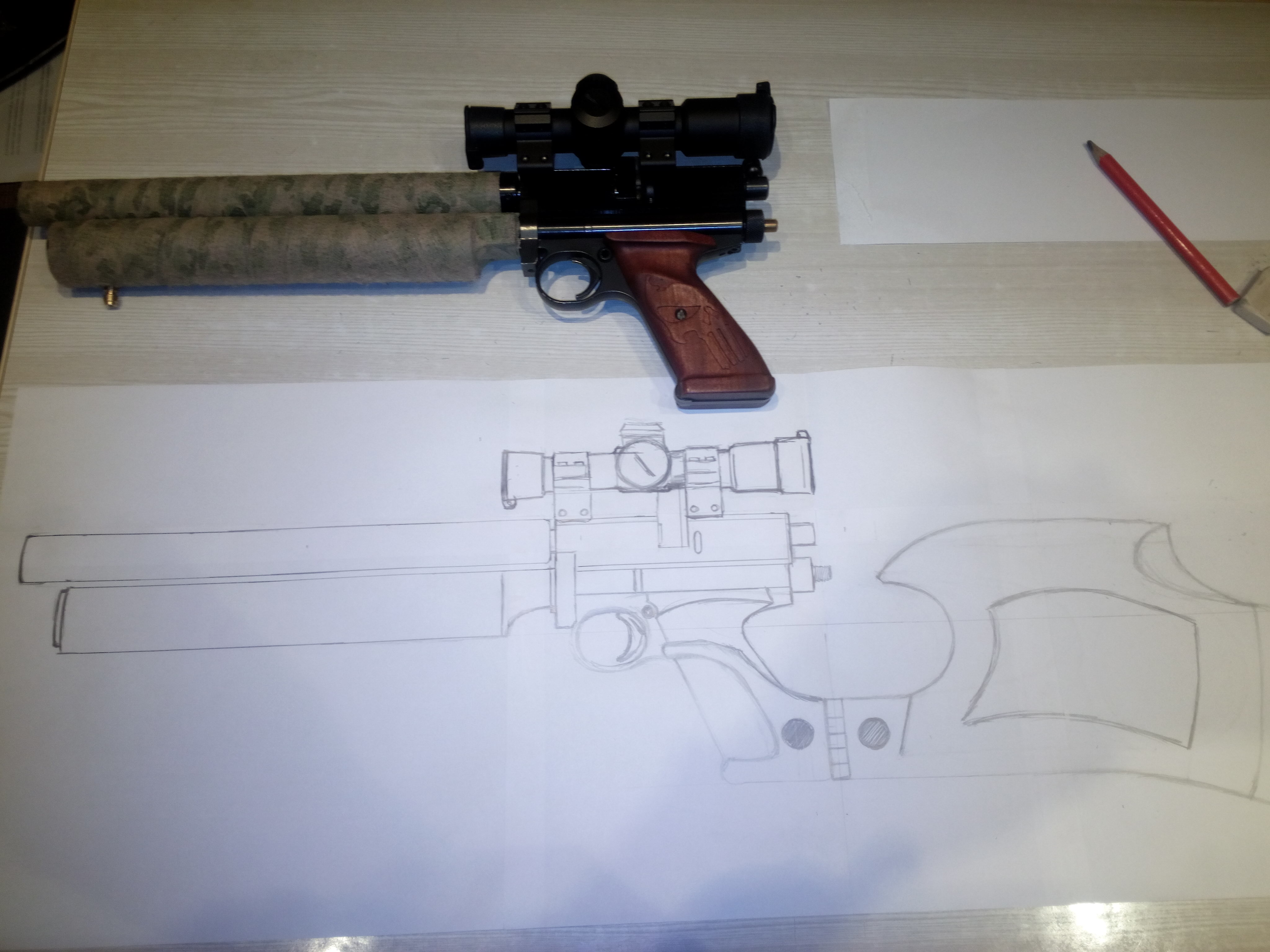 Остались нерешенные вопросы с прицельными, буду думать ставить открытые, ОП или калик, крепить ли коробку к ложу стандартными винтами или вырезать надствольную накладку с прорезями типа СВД (вот зачем придумал на ходу, придется делать), скоба над курком, утяжелитель на ствол и т.д. и т.п. Как додумаю скину фото.