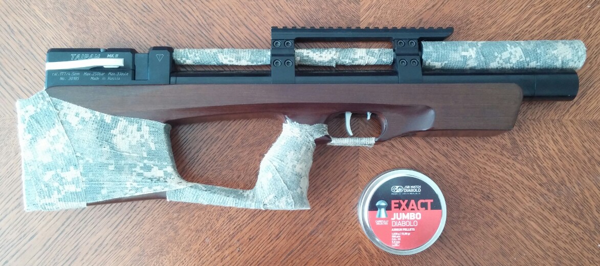 Тайпан МК2 5,5 коротыш. Тайпану 2 месяца. Я первый хозяин. Стволик 35см, чок. Общая длинна 59,5см. Настроен на ..58 jsb 1,03. С 240 до 125 60 раз. В комплекте два магазина, лоток для одиночной стрельбы, штуцер и полный комплект РТИ (дополнительно заказывал из России). На фото мой лучший результат (из машины, лес, 50метров, 5 пуль). Цена 2000 BYN.