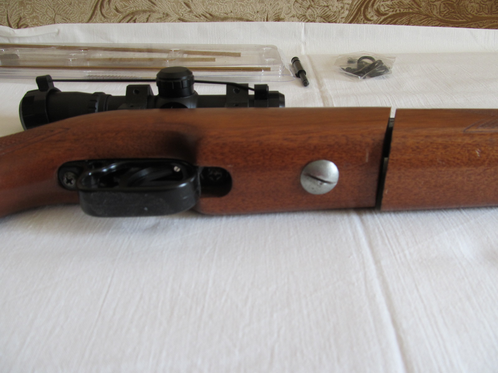В комплекте с винтовкой идёт прицел Щ4.5х20, набор для чистки, родной досылатель, и резинки для замены в накопителе и досылатиле. Могу ещё добавить несколько досылателей для разных пулек.