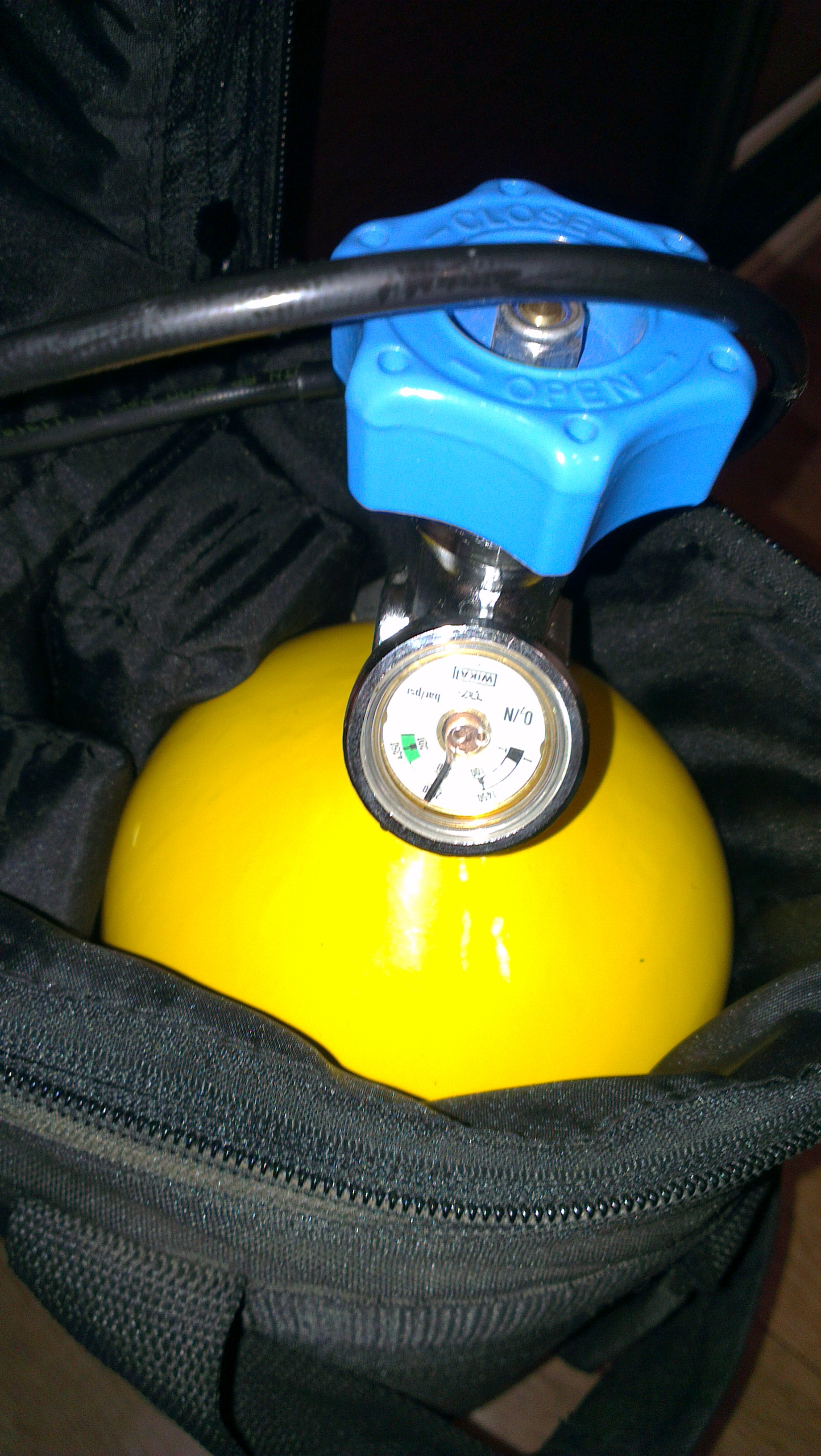 В комплекте: плотный противоударный чехол из кордуры, документы. Заправлен до 200 Атм. Принимается к заправке без вопросов.