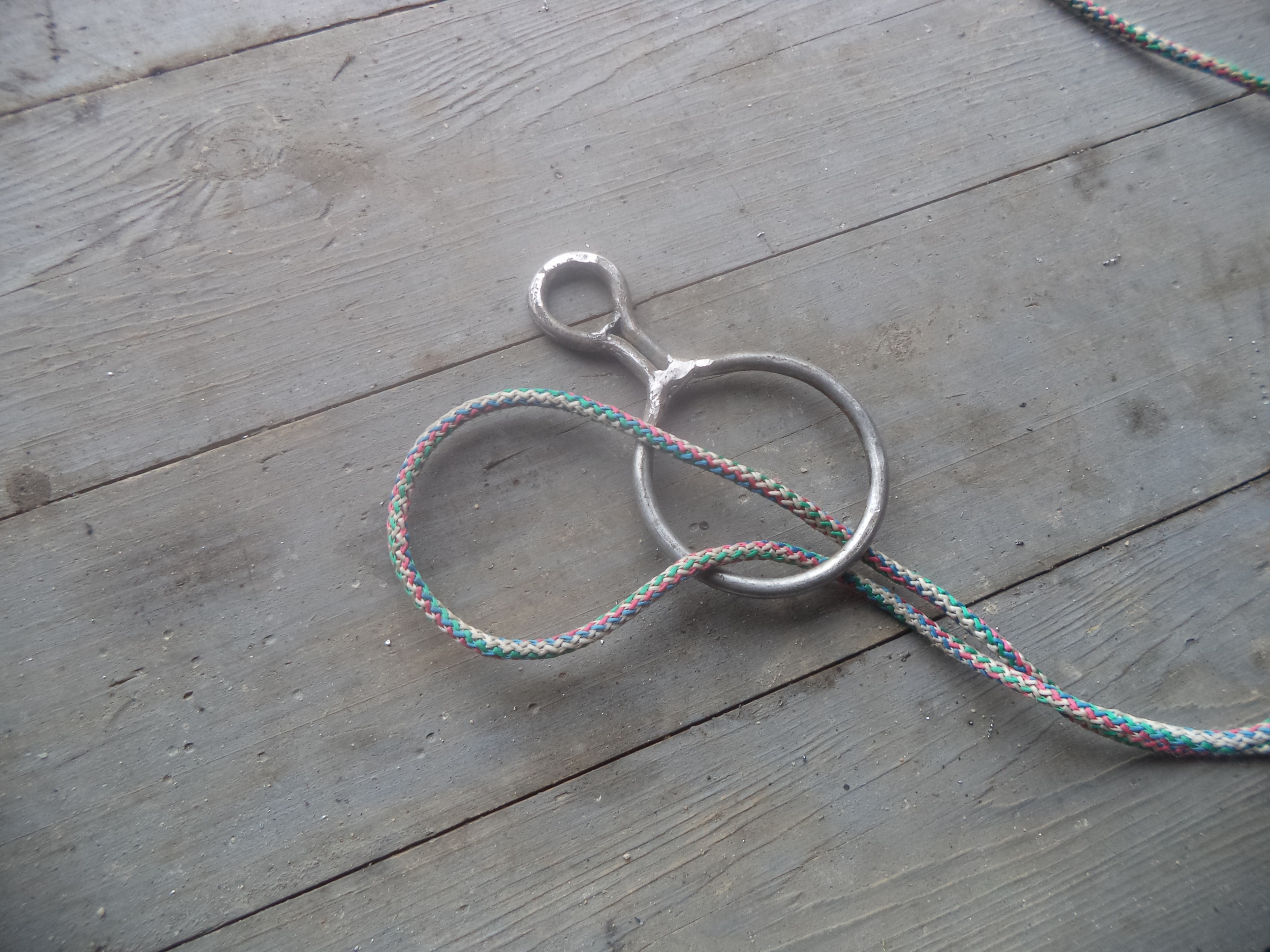 Сегодня изготовил "восьмёрку" для быстрого крепления якоря. Идею "стырил" из интернета. По отзывам, очень удобная штука. Можно использовать промышленную "восьмёрку" (такую используют альпинисты), но я решил изготовить сам. Понадобилось: кусок "катанки" из нержавейки диам. 6 мм, тиски (для загибания проволоки), сварочный аппарат и полчаса свободного времени. Диаметр большого кольца 7 см, малого - 2 см. Верёвка просаживается в большое кольцо, как на фото, а малое цепляется за карабин, который, в свою очередь, цепляется за леер, либо за другую часть лодки.