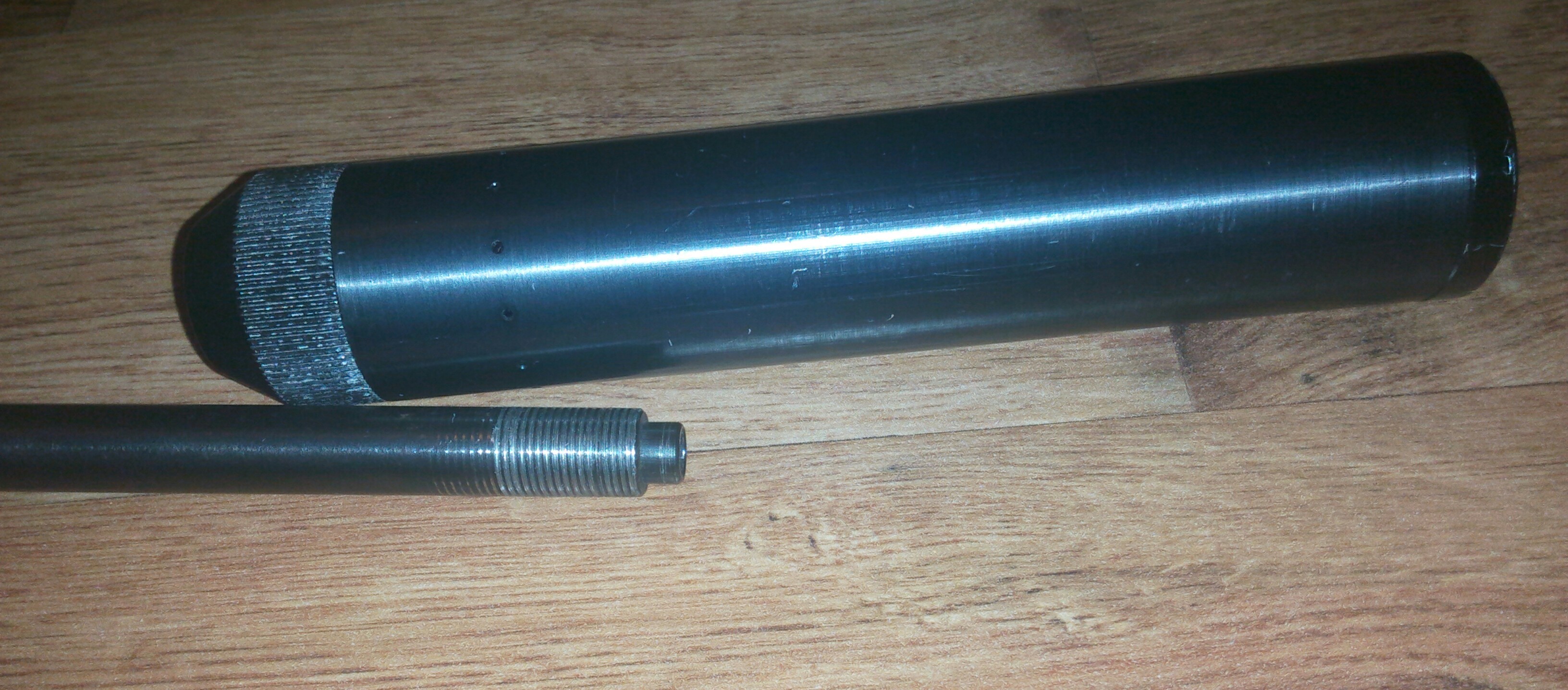 Модер на 30 мм трубе, 4 стакана, под ствол что в теме, резьба на ствол 12х1 если правильно померял, длина 15,5см. 50 рублей.