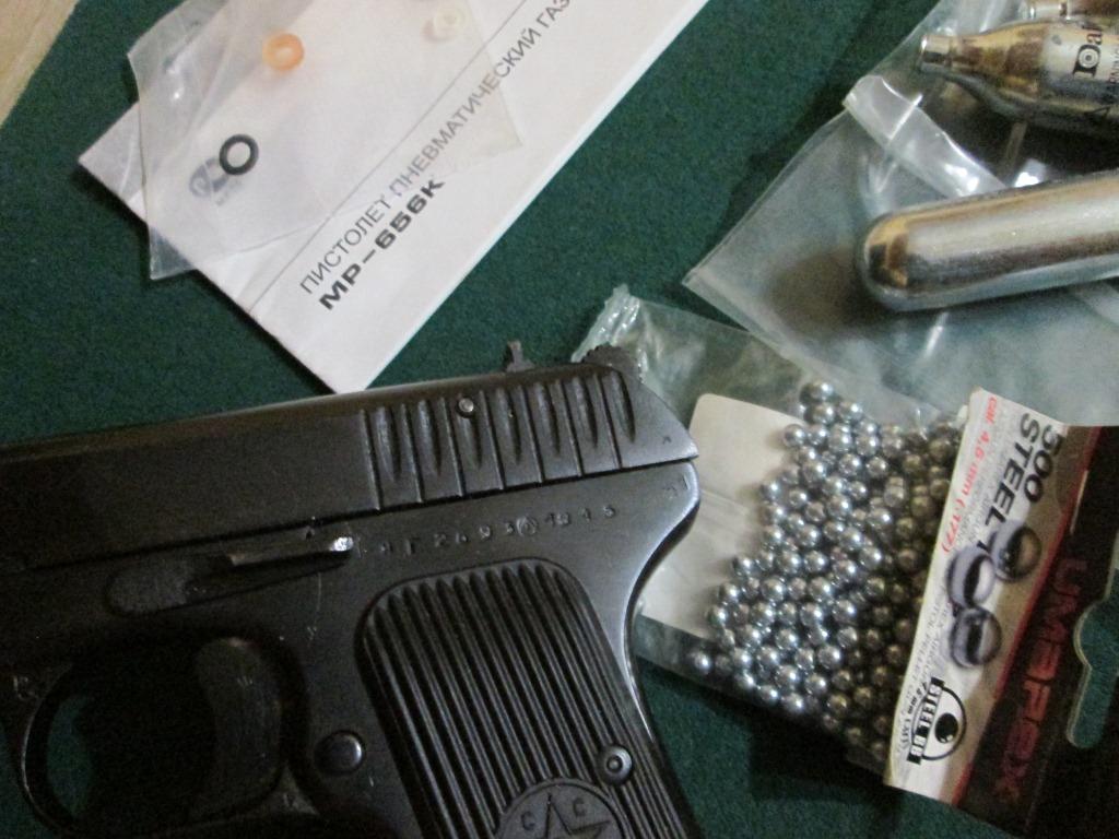 Без настрела. В комплекте шарики, балоны, комплект уплотнений. Разумеется, что весь пистолет на одном номере.