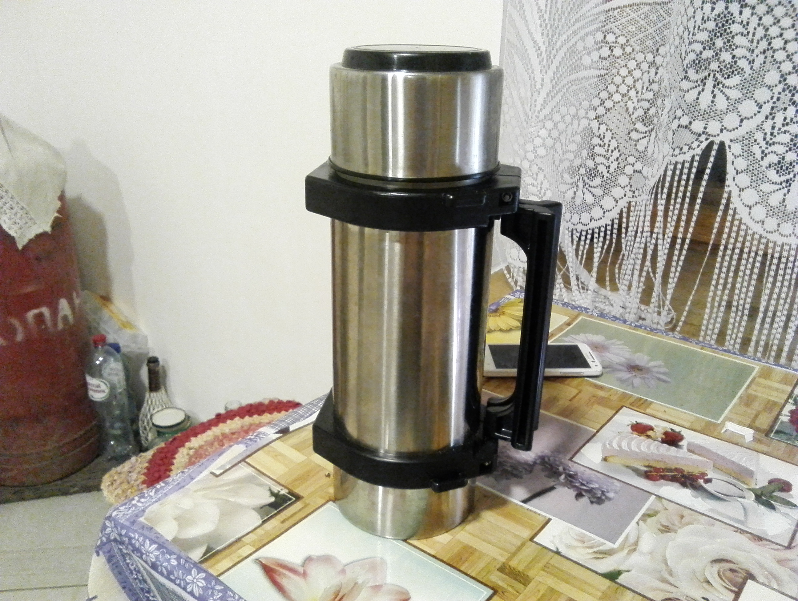 Вот мой рабочий вариант на данный момент, таскаю его везде, и на рыбалку, и на охоту, да и в командировку всегда в машину беру. Температуру держит просто на отлично (по сравнению с другими моими термосами), к вечеру обычно чай или кофе остаются если не кипятком то очень горячими, просто так не попьешь приходится немного подождать. Кстати, в начале я его всегда немного прогреваю, залью кипятка и закрою его минут на пять, и только после этого уже завариваю себе напиток, может из за этого температура держится.
