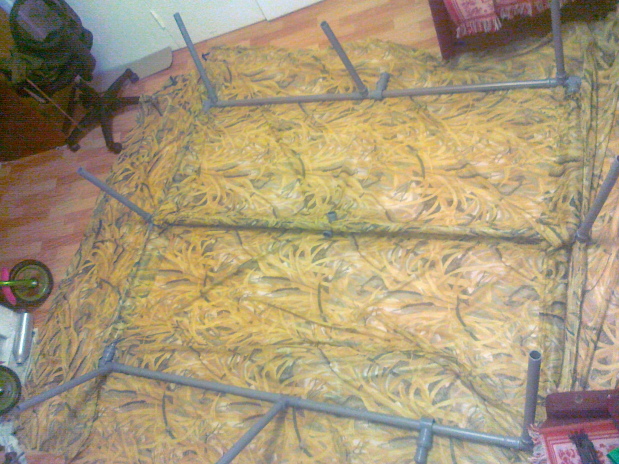 Скрадок разборный. Скелет из труб полипропилена 1,8мм. диаметром 32мм. Соединение узлов идет по принципу "папа-мама". Длинна общего стыка - 4 см (или по 4 см каждой стороны). Скрадок размером 1,5х2м. +- пару см. Высотой 0,5м. В собранном виде имеет форму усеченной пирамиды. Рассчитан на 2 человек по 0,75х2м. пространства каждому. Стрельба идет через откидывающиеся руками две распашные "двери". Собственно скрадок легко трансформируется в одноместный, путем соединения меньшего количества труб. Покрытие - сетчатый материал (просвечивающийся). Когда находишься под ним, то видно все небо хорошо, при этом человека и его движения не заметны и не видны. Для труб в материале сделаны рукава для вставки. По углам и середине сетки прошиты петли для натяжки. От размеров скрадка 1,5х2 метра сетка отступает на примерно 70 см,образуя боковые грани со всех сторон.