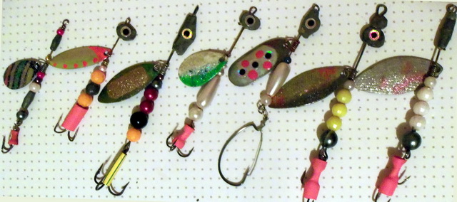 На работе в офисе как-то увидел сгоревший чайник из нержавейки вот тут и пришла идея пустить его на лепестки для вертушек.Вырезал лепестки по шаблону у меня их три, отлил в столовой ложке свинцовую биту и штамп готов, заготовку ложем в ложку с верху свинцовую биту и молотком, лепесток готов. Сердечники я давно точу при помощи дрели из пипок от старых автомобильных или тракторных камер, в любом авто гараже их хватает. Проволоку для основы вертушки использую от сварочного полуавтомата диаметром 0,6 мм из нержавеющей стали, покупаю в катушке с намоткой в 1кг. Вот с дужками была проблема как их сделать в домашних условиях на коленке , оказалась всё очень проста пробил гаечным ключом на наковальне и все как две капли, не отличишь. Проволока для дужек используется нихром 1,2мм, можно медную, от трансформатора. Шарики под сердечник хотел взять от бус, но увидел у сына пульки пластмассовые от игрушечного пистолета диаметром 6 мм, просверлил отверстия померил как тут были, пульки продаются в любом игрушечном магазине за копейки. Опушки на крючки давно вяжу из старых бантов. Ну вот вроде и всё.