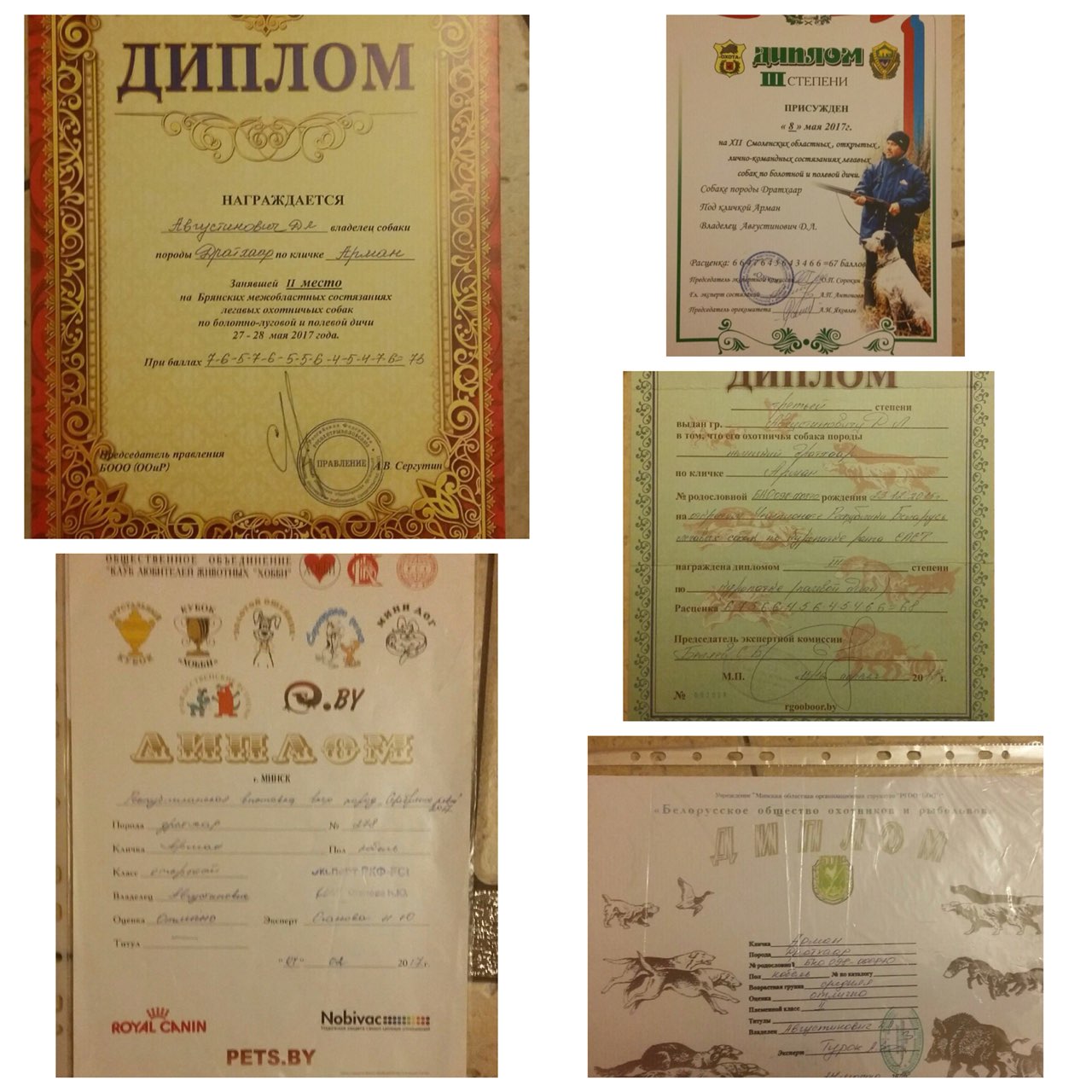 (Все дипломы за рабочие качества с указанием по виду дичи Д3-БД, Д3-ПД, Д2-КС)