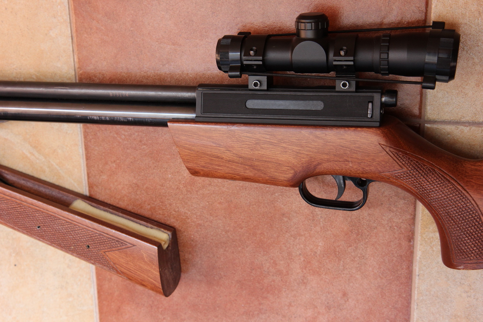 Предыдущим рукастым владельцем сделан ап всего, что только можно: алюминиевая восьмерка, металлическая передняя пробка, ствольная коробка-капролоновая, закреплена болтом, оси и втулки рычага накачки закалены, фаска, удлиненный досылатель.