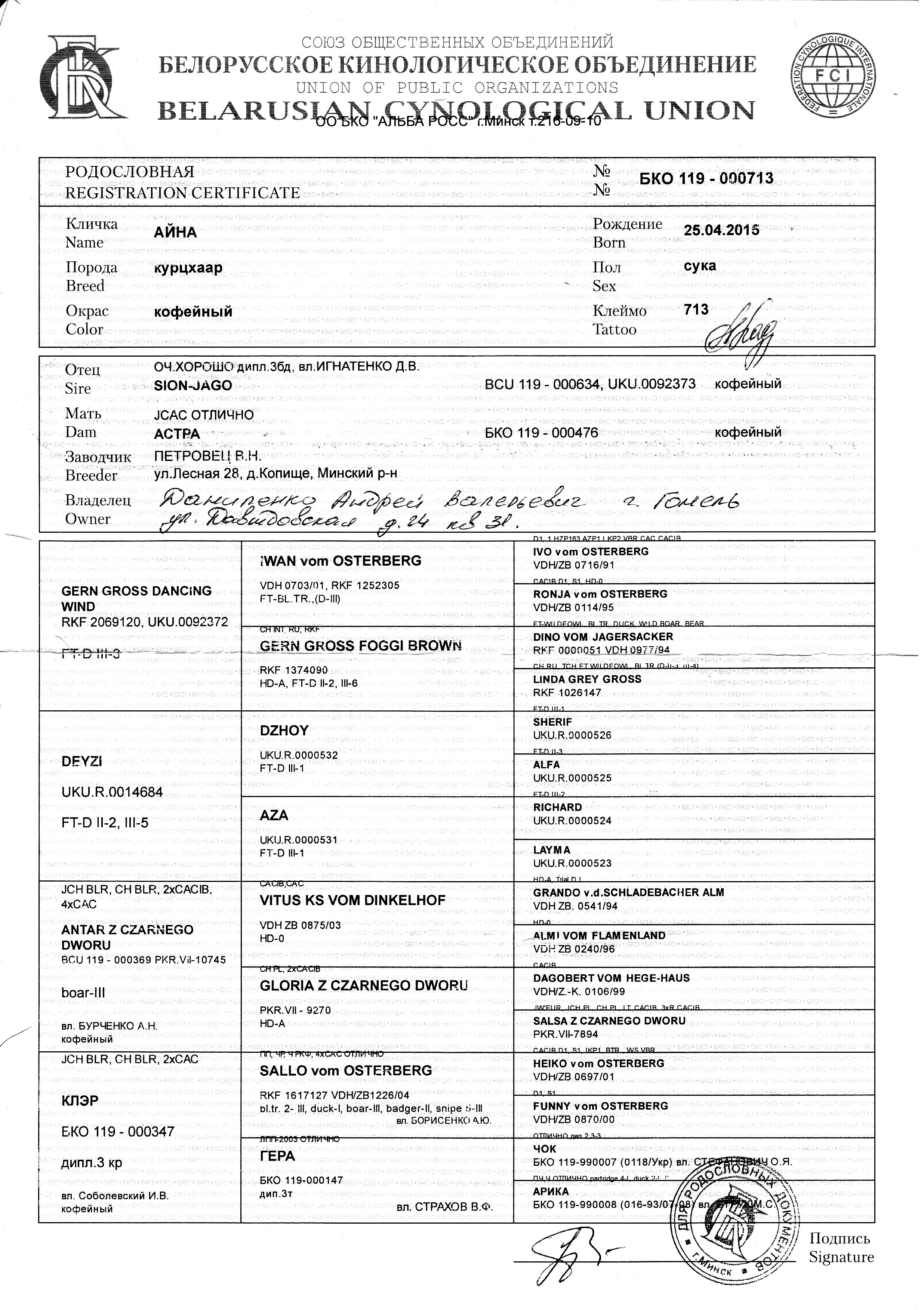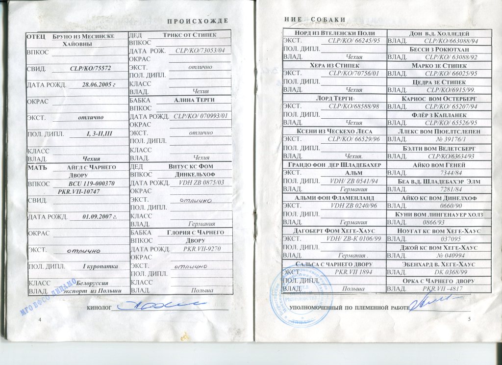 2.2.1 Кличка, номер родословной, фотография родословной с двух сторон.